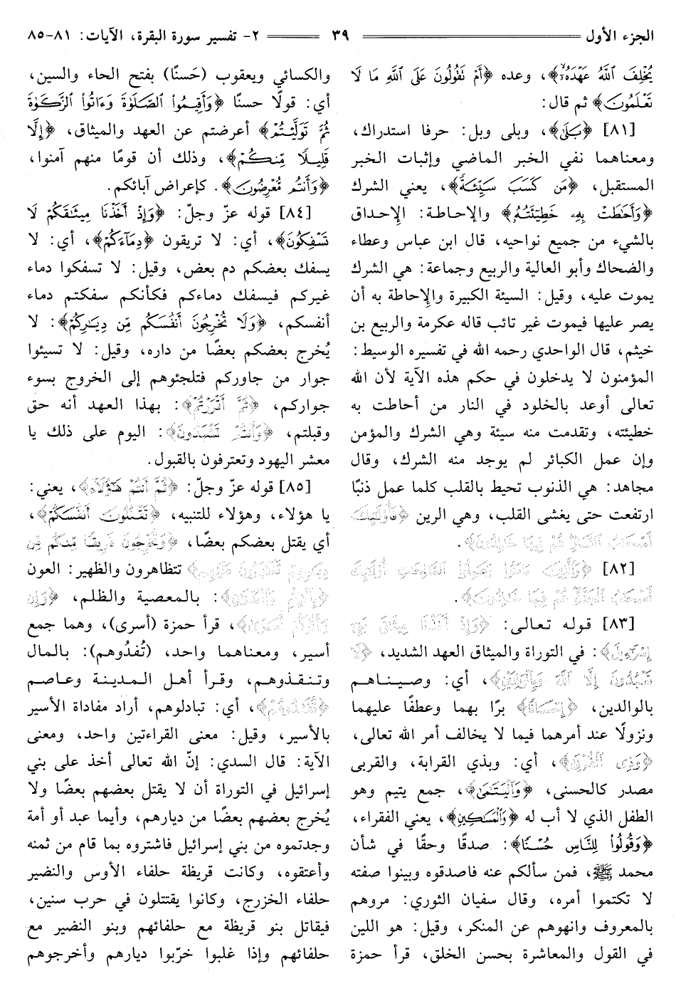 [84] قَوْلُهُ عَزَّ وَجَلَّ: {وَإِذْ أَخَذْنَا مِيثَاقَكُمْ لَا تَسْفِكُونَ} [البقرة: 84] أي: لا تريقون {دِمَاءَكُمْ} [البقرة: 84] أَيْ: لَا يَسْفِكُ بَعْضُكُمْ دَمَ بَعْضٍ، وَقِيلَ: لَا تَسْفِكُوا دِمَاءَ غيركم فيسفك دِمَاءَكُمْ فَكَأَنَّكُمْ سَفَكْتُمْ دِمَاءَ أَنْفُسِكُمْ، {وَلَا تُخْرِجُونَ أَنْفُسَكُمْ مِنْ دِيَارِكُمْ} [البقرة: 84] لَا يُخرج بَعْضُكُمْ بَعْضًا مِنْ دَارِهِ، وَقِيلَ: لَا تُسِيئُوا جِوَارَ مَنْ جَاوَرَكُمْ فَتُلْجِئُوهُمْ إِلَى الْخُرُوجِ بسوء جواركم، {ثُمَّ أَقْرَرْتُمْ} [البقرة: 84] بِهَذَا الْعَهْدِ أَنَّهُ حَقٌّ وَقَبِلْتُمْ، {وَأَنْتُمْ تَشْهَدُونَ} [البقرة: 84] الْيَوْمَ عَلَى ذَلِكَ يَا مَعْشَرَ اليهود وتعترفون بِالْقَبُولِ.
