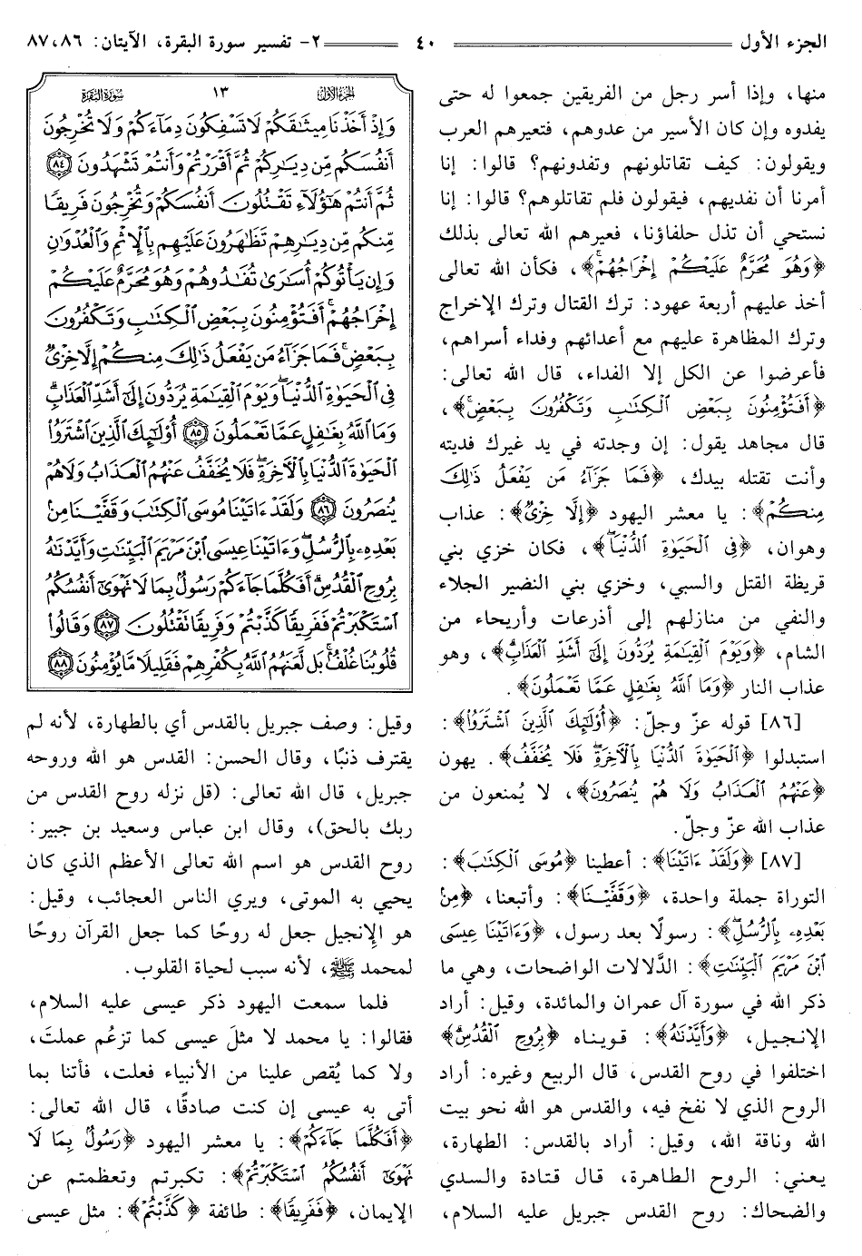 [87] {وَلَقَدْ آتَيْنَا} [البقرة: 87] أعطينا {مُوسَى الْكِتَابَ} [البقرة: 87] التوراة جملة واحدة، {وَقَفَّيْنَا} [البقرة: 87] وأتبعنا، {مِنْ بَعْدِهِ بِالرُّسُلِ} [البقرة: 87] رَسُولًا بَعْدَ رَسُولٍ، {وَآتَيْنَا عِيسَى ابْنَ مَرْيَمَ الْبَيِّنَاتِ} [البقرة: 87] الدَّلالات الْوَاضِحَاتِ، وَهِيَ مَا ذَكَرَ اللَّهُ فِي سُورَةِ آلِ عِمْرَانَ وَالْمَائِدَةِ، وَقِيلَ: أَرَادَ الْإِنْجِيلَ، {وَأَيَّدْنَاهُ} [البقرة: 87] قويناه {بِرُوحِ الْقُدُسِ} [البقرة: 87] اختلفوا فِي رُوحِ الْقُدُسِ، قَالَ الرَّبِيعُ وغيره: أراد الروح الذي لا نُفِخَ فِيهِ، وَالْقُدُسُ هُوَ اللَّهُ نَحْوَ بَيْتِ اللَّهِ وَنَاقَةِ اللَّهِ، وَقِيلَ: أَرَادَ بِالْقُدُسِ: الطِّهَارَةَ، يَعْنِي. الروح الطاهرة، قَالَ قَتَادَةُ وَالسُّدِّيُّ وَالضَّحَّاكُ: رُوحُ القدس جبريل عليه السلام، وقيل: وُصِفَ جِبْرِيلُ بِالْقُدُسِ أَيْ بِالطَّهَارَةِ، لِأَنَّهُ لَمْ يَقْتَرِفْ ذَنْبًا، وَقَالَ الْحَسَنُ: الْقُدُسُ هُوَ اللَّهُ وَرُوحُهُ جِبْرِيلُ، قَالَ اللَّهُ تَعَالَى: {قُلْ نَزَّلَهُ رُوحُ الْقُدُسِ مِنْ رَبِّكَ بِالْحَقِّ} [النحل: 102] وَقَالَ ابْنُ عَبَّاسٍ وَسَعِيدُ بْنُ جُبَيْرٍ: رُوحُ الْقُدُسِ هُوَ اسْمُ الله تعالى الأعظم الذي كان يحيي به الموتى، ويري الناس الْعَجَائِبَ، وَقِيلَ: هُوَ الْإِنْجِيلُ جَعَلَ لَهُ رُوحًا كَمَا جَعْلَ الْقُرْآنَ رُوحًا لِمُحَمَّدٍ صَلَّى اللَّهُ عَلَيْهِ وَسَلَّمَ، لِأَنَّهُ سَبَبٌ لِحَيَاةِ الْقُلُوبِ.