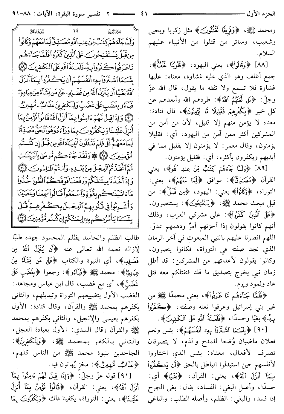 [91] قَوْلُهُ عَزَّ وَجَلَّ: {وَإِذَا قِيلَ لَهُمْ آمِنُوا بِمَا أَنْزَلَ اللَّهُ} [البقرة: 91] يَعْنِي: الْقُرْآنَ، {قَالُوا نُؤْمِنُ بِمَا أُنْزِلَ عَلَيْنَا} [البقرة: 91] يَعْنِي: التَّوْرَاةَ، يَكْفِينَا ذَلِكَ {وَيَكْفُرُونَ بِمَا وَرَاءَهُ} [البقرة: 91]