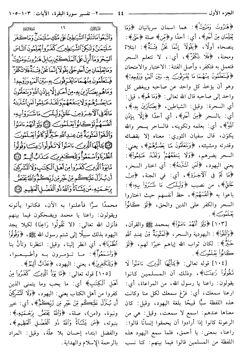 {هَارُوتَ وَمَارُوتَ} [البقرة: 102] هما اسمان سريانيان {وَمَا يُعَلِّمَانِ مِنْ أَحَدٍ} [البقرة: 102] أَيْ: أَحَدًا وَ (مِنْ) صِلَةٌ {حَتَّى} [البقرة: 102] ينصحاه أولًا، {يَقُولَا إِنَّمَا نَحْنُ فِتْنَةٌ} [البقرة: 102] ابتلاءٌ ومحنة {فَلَا تَكْفُرْ} [البقرة: 102] أَيْ: لَا تَتَعَلَّمِ السِّحْرَ فَتَعْمَلَ بِهِ فَتَكْفُرَ، وَأَصْلُ الْفِتْنَةِ: الِاخْتِبَارُ والامتحان {فَيَتَعَلَّمُونَ مِنْهُمَا مَا يُفَرِّقُونَ بِهِ بَيْنَ الْمَرْءِ وَزَوْجِهِ} [البقرة: 102] وهو أَنْ يُؤْخَذَ كُلُّ وَاحِدٍ عَنْ صَاحِبِهِ وَيُبَغَّضُ كُلُّ وَاحِدٍ إِلَى صَاحِبِهِ قَالَ اللَّهُ تَعَالَى: {وَمَا هُمْ} [البقرة: 102] قِيلَ: أَيِ السَّحَرَةُ. وَقِيلَ: الشَّيَاطِينُ، {بِضَارِّينَ بِهِ} [البقرة: 102] أي: بالسحر {مِنْ أَحَدٍ} [البقرة: 102] أَيْ أَحَدًا {إِلَّا بِإِذْنِ اللَّهِ} [البقرة: 102] أَيْ: بِعِلْمِهِ وَتَكْوِينِهِ، فَالسَّاحِرُ يَسْحَرُ وَاللَّهُ يُكَوِّنُ، قَالَ سُفْيَانُ الثَّوْرِيُّ: مَعْنَاهُ إِلَّا بِقَضَائِهِ وَقُدْرَتِهِ وَمَشِيئَتِهِ، {وَيَتَعَلَّمُونَ مَا يَضُرُّهُمْ} [البقرة: 102] يعني: السِّحْرَ يَضُرُّهُمْ، {وَلَا يَنْفَعُهُمْ وَلَقَدْ عَلِمُوا} [البقرة: 102] يعني اليهود، {لَمَنِ اشْتَرَاهُ} [البقرة: 102] أَيِ اخْتَارَ السِّحْرَ، {مَا لَهُ فِي الْآخِرَةِ} [البقرة: 102] أي: في الجنة، {مِنْ خَلَاقٍ} [البقرة: 102] مِنْ نَصِيبٍ {وَلَبِئْسَ مَا شَرَوْا بِهِ} [البقرة: 102] باعوا به {أَنْفُسَهُمْ} [البقرة: 102] حظ أنفسهم حيث اختاروا السحر وَالْكُفْرَ عَلَى الدِّينِ وَالْحَقِّ، {لَوْ كَانُوا يَعْلَمُونَ} [البقرة: 102]