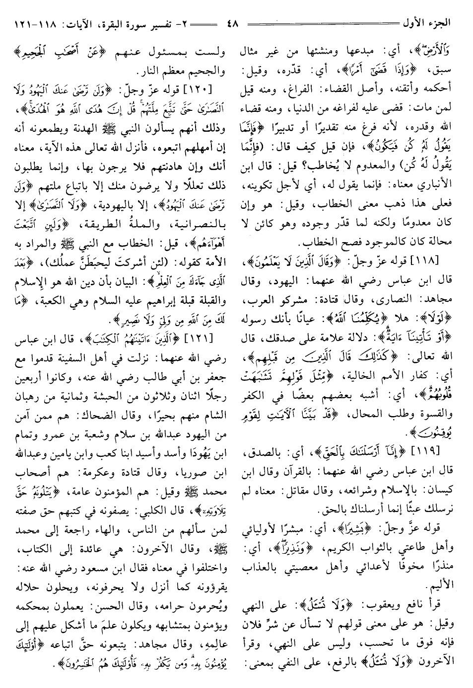 [120] ، قَوْلُهُ عَزَّ وَجَلَّ: {وَلَنْ تَرْضَى عَنْكَ الْيَهُودُ وَلَا النَّصَارَى حَتَّى تَتَّبِعَ مِلَّتَهُمْ قُلْ إِنَّ هُدَى اللَّهِ هُوَ الْهُدَى} [البقرة: 120] وذلك أنهم يَسْأَلُونَ النَّبِيَّ صَلَّى اللَّهُ عَلَيْهِ وسلم الهدنة ويطمعونه أَنَّهُ إِنْ أَمْهَلَهُمُ اتَّبَعُوهُ، فَأَنْزَلَ اللَّهُ تَعَالَى هَذِهِ الْآيَةَ، مَعْنَاهُ أنك وإن هادنتهم فلا يرجون بِهَا، وَإِنَّمَا يَطْلُبُونَ ذَلِكَ تَعَلُّلًا وَلَا يَرْضَوْنَ مِنْكَ إِلَّا بِاتِّبَاعِ ملتهم {وَلَنْ تَرْضَى عَنْكَ الْيَهُودُ} [البقرة: 120] إلا باليهودية، {وَلَا النَّصَارَى} [البقرة: 120] إِلَّا بِالنَّصْرَانِيَّةِ، وَالْمِلَّةُ الطَّرِيقَةُ، {وَلَئِنِ اتَّبَعْتَ أَهْوَاءَهُمْ} [البقرة: 120] قِيلَ: الْخِطَابُ مَعَ النَّبِيِّ صَلَّى اللَّهُ عَلَيْهِ وَسَلَّمَ وَالْمُرَادُ بِهِ الْأُمَّةُ كَقَوْلِهِ: {لَئِنْ أَشْرَكْتَ لَيَحْبَطَنَّ عَمَلُكَ} [الزُّمَرِ: 65] {بَعْدَ الَّذِي جَاءَكَ مِنَ الْعِلْمِ} [البقرة: 120] الْبَيَانِ بِأَنَّ دِينَ اللَّهِ هُوَ الْإِسْلَامُ وَالْقِبْلَةَ قِبْلَةُ إِبْرَاهِيمَ عَلَيْهِ السَّلَامُ وَهِيَ الْكَعْبَةُ، {مَا لَكَ مِنَ اللَّهِ مِنْ وَلِيٍّ وَلَا نَصِيرٍ} [البقرة: 120]