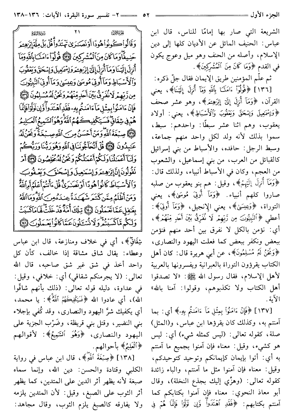 [136] {قُولُوا آمَنَّا بِاللَّهِ وَمَا أُنْزِلَ إِلَيْنَا} [البقرة: 136] يَعْنِي الْقُرْآنَ، {وَمَا أُنْزِلَ إِلَى إِبْرَاهِيمَ} [البقرة: 136] وَهُوَ عَشْرُ صُحُفٍ {وَإِسْمَاعِيلَ وَإِسْحَاقَ وَيَعْقُوبَ وَالْأَسْبَاطِ} [البقرة: 136] يَعْنِي: أَوْلَادَ يَعْقُوبَ، وَهُمُ اثْنَا عَشَرَ سِبْطًا، وَاحِدُهُمْ: سِبْطٌ، سُمُّوا بِذَلِكَ لِأَنَّهُ وُلِدَ لِكُلِّ وَاحِدٍ مِنْهُمْ جَمَاعَةٌ، وَسِبْطُ الرَّجُلِ: حَافِدُهُ، وَالْأَسْبَاطُ مِنْ بَنِي إِسْرَائِيلَ كَالْقَبَائِلِ مِنَ الْعَرَبِ، مِنْ بَنِي إِسْمَاعِيلَ، وَالشُّعُوبِ مِنَ الْعَجَمِ، وَكَانَ فِي الْأَسْبَاطِ أَنْبِيَاءٌ، وَلِذَلِكَ قَالَ: {وَمَا أُنْزِلَ إِلَيْنَا} [البقرة: 136] وَقِيلَ: هُمْ بَنُو يَعْقُوبَ مِنْ صُلْبِهِ صَارُوا كُلُّهُمْ أَنْبِيَاءَ. {وَمَا أُوتِيَ مُوسَى} [البقرة: 136] يعني التوراة، {وَعِيسَى} [البقرة: 136] يعني الإنجيل، {وَمَا أُوتِيَ} [البقرة: 136] أُعْطِيَ {النَّبِيُّونَ مِنْ رَبِّهِمْ لَا نُفَرِّقُ بَيْنَ أَحَدٍ مِنْهُمْ} [البقرة: 136] أَيْ: نُؤْمِنُ بِالْكُلِّ لَا نُفَرِّقُ بَيْنَ أَحَدٍ مِنْهُمْ فَنُؤْمِنُ بِبَعْضٍ وَنَكْفُرُ بِبَعْضٍ كَمَا فَعَلَتِ الْيَهُودُ والنصارى، {وَنَحْنُ لَهُ مُسْلِمُونَ} [البقرة: 136] عَنْ أَبِي هُرَيْرَةَ قَالَ: كَانَ أهل الكتاب يقرؤون التَّوْرَاةَ بِالْعِبْرَانِيَّةِ وَيُفَسِّرُونَهَا بِالْعَرَبِيَّةِ لِأَهْلِ الْإِسْلَامِ، فَقَالَ رَسُولُ اللَّهِ صَلَّى اللَّهُ عَلَيْهِ وَسَلَّمَ: «لَا تُصَدِّقُوا أَهْلَ الْكِتَابِ وَلَا تُكَذِّبُوهُمْ، وَقُولُوا: آمَنَّا بِاللَّهِ» الْآيَةَ.