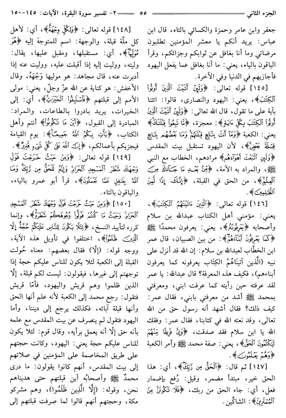 [150] {وَمِنْ حَيْثُ خَرَجْتَ فَوَلِّ وَجْهَكَ شَطْرَ الْمَسْجِدِ الْحَرَامِ وَحَيْثُ مَا كُنْتُمْ فَوَلُّوا وُجُوهَكُمْ شَطْرَهُ} [البقرة: 150] وإنما كرره لتأييد النَّسْخِ، {لِئَلَّا يَكُونَ لِلنَّاسِ عَلَيْكُمْ حُجَّةٌ إِلَّا الَّذِينَ ظَلَمُوا} [الْبَقَرَةِ: 150] اخْتَلَفُوا فِي تَأْوِيلِ هَذِهِ الْآيَةِ، وَوَجْهِ قَوْلِهِ: (إِلَّا) فَقَالَ بَعْضُهُمْ: مَعْنَاهُ حُوِّلَتِ الْقِبْلَةُ إِلَى الْكَعْبَةِ لِئَلَّا يَكُونَ لِلنَّاسِ عَلَيْكُمْ حُجَّةٌ إِذَا تَوَجَّهْتُمْ إِلَى غَيْرِهَا، فَيَقُولُونَ: لَيْسَتْ لَكُمْ قِبْلَةٌ، إِلَّا الَّذِينَ ظلموا وهم قُرَيْشٌ وَالْيَهُودُ، فَأَمَّا قُرَيْشٌ فَتَقُولُ: رَجَعَ مُحَمَّدٌ إِلَى الْكَعْبَةِ لِأَنَّهُ عَلِمَ أَنَّهَا الْحَقُّ وَأَنَّهَا قِبْلَةُ آبَائِهِ، فَكَذَلِكَ يَرْجِعُ إِلَى دِينِنَا، وَأَمَّا الْيَهُودُ فَتَقُولُ لَمْ يَنْصَرِفْ عَنْ بَيْتِ الْمَقْدِسِ مَعَ عِلْمِهِ بِأَنَّهُ حَقٌّ إِلَّا أَنَّهُ يَعْمَلُ بِرَأْيِهِ، وَقَالَ قَوْمٌ: لِئَلَّا يَكُونَ لِلنَّاسِ عَلَيْكُمْ حُجَّةٌ يَعْنِي: الْيَهُودَ، وَكَانَتْ حُجَّتُهُمْ عَلَى طَرِيقِ الْمُخَاصَمَةِ عَلَى الْمُؤْمِنِينَ فِي صَلَاتِهِمْ إِلَى بَيْتِ الْمَقْدِسِ، أَنَّهُمْ كَانُوا يَقُولُونَ: مَا دَرَى مُحَمَّدٌ صَلَّى اللَّهُ عَلَيْهِ وَسَلَّمَ وَأَصْحَابُهُ أَيْنَ قَبِلَتُهُمْ حَتَّى هَدَيْنَاهُمْ نَحْنُ، وَقَوْلُهُ: {إِلَّا الَّذِينَ ظَلَمُوا} [البقرة: 150] وهم مُشْرِكُو مَكَّةَ، وَحُجَّتُهُمْ أَنَّهُمْ قَالُوا لَمَّا صُرِفَتْ قَبِلَتُهُمْ إِلَى