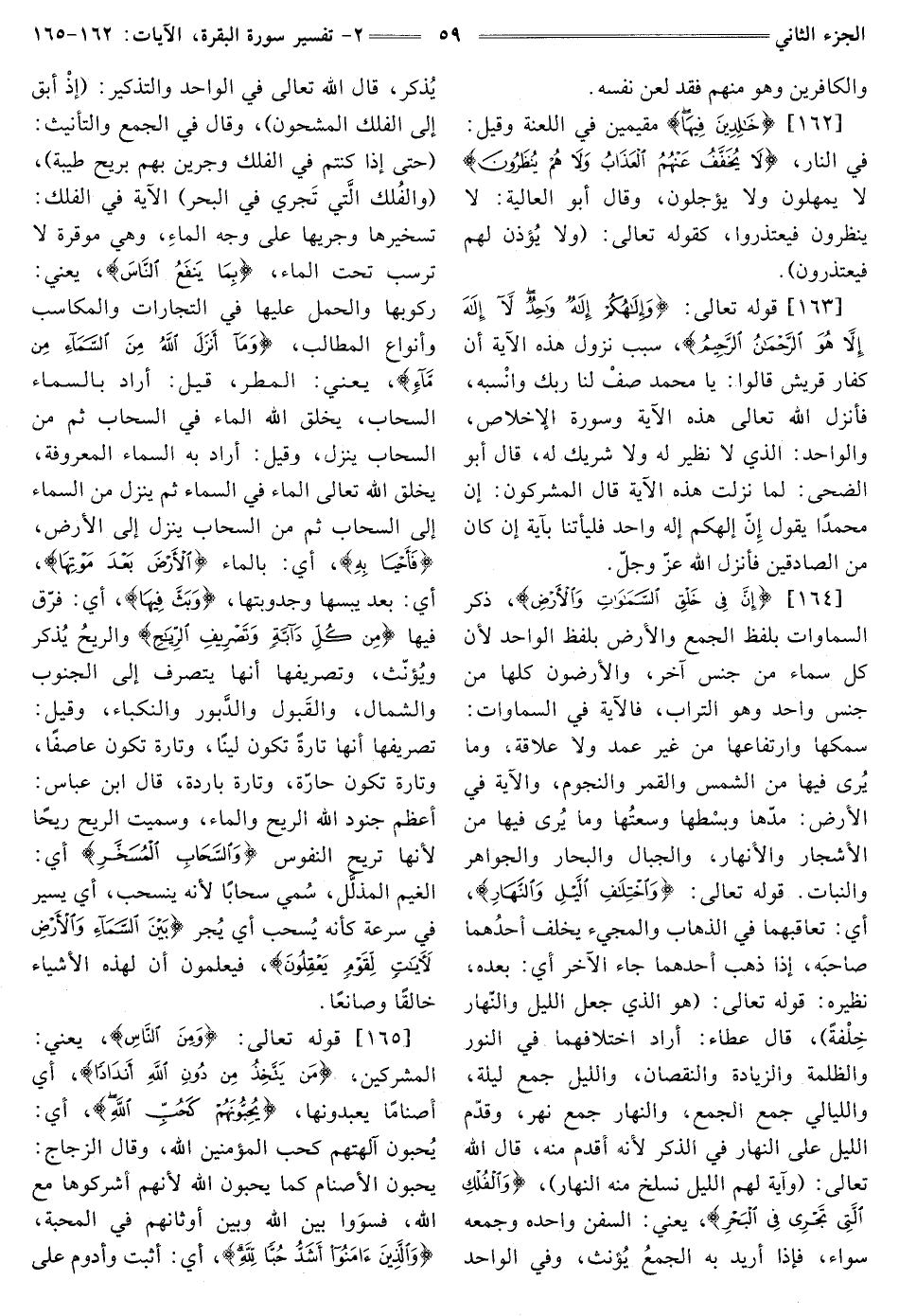 [164] {إِنَّ فِي خَلْقِ السَّمَاوَاتِ وَالْأَرْضِ} [البقرة: 164] ذَكَرَ السَّمَاوَاتِ بِلَفْظِ الْجَمْعِ وَالْأَرْضَ بِلَفْظِ الْوَاحِدِ لِأَنَّ كُلَّ سَمَاءٍ مِنْ جِنْسٍ آخَرَ، وَالْأَرْضُونَ كُلُّهَا مِنْ جِنْسٍ وَاحِدٍ وَهُوَ التُّرَابُ، فَالْآيَةُ فِي السَّمَاوَاتِ: سُمْكُهَا وَارْتِفَاعُهَا مِنْ غَيْرِ عَمَدٍ وَلَا عِلَاقَةٍ، وما يرى فِيهَا مِنَ الشَّمْسِ وَالْقَمَرِ وَالنُّجُومِ، وَالْآيَةُ فِي الْأَرْضِ: مَدُّهَا وَبَسْطُهَا وسعتها وما يرى فِيهَا مِنَ الْأَشْجَارِ وَالْأَنْهَارِ، وَالْجِبَالِ وَالْبِحَارِ وَالْجَوَاهِرِ وَالنَّبَاتِ. قَوْلُهُ تَعَالَى: {وَاخْتِلَافِ اللَّيْلِ وَالنَّهَارِ} [البقرة: 164] أَيْ: تَعَاقُبُهُمَا فِي الذَّهَابِ وَالْمَجِيءِ يَخْلُفُ أَحَدُهُمَا صَاحِبَهُ، إِذَا ذَهَبَ أحدهما جاء الآخر أَيْ: بَعْدَهُ، نَظِيرُهُ: قَوْلُهُ تَعَالَى: {وَهُوَ الَّذِي جَعَلَ اللَّيْلَ وَالنَّهَارَ خِلْفَةً} [الْفُرْقَانِ: 62] قَالَ عَطَاءٌ: أَرَادَ اخْتِلَافَهُمَا فِي النُّورِ وَالظُّلْمَةِ وَالزِّيَادَةِ وَالنُّقْصَانِ، وَاللَّيْلُ جَمْعُ لَيْلَةٍ، وَاللَّيَالِي جمع الجمع، والنهار جمع نُهُرٌ، وَقَدَّمَ اللَّيْلَ عَلَى النَّهَارِ فِي الذِّكْرِ لِأَنَّهُ أَقْدَمُ مِنْهُ، قَالَ اللَّهُ تَعَالَى: {وَآيَةٌ لَهُمُ اللَّيْلُ نَسْلَخُ مِنْهُ النَّهَارَ} [يس: 37] {وَالْفُلْكِ الَّتِي تَجْرِي فِي الْبَحْرِ} [البقرة: 164] يَعْنِي: السُّفُنَ وَاحِدُهُ وَجَمْعُهُ سَوَاءٌ، فَإِذَا أُرِيدَ بِهِ الْجَمْعُ يُؤَنَّثُ، وَفِي الْوَاحِدِ يُذَكَّرُ، قَالَ اللَّهُ تَعَالَى فِي الْوَاحِدِ وَالتَّذْكِيرِ: {إِذْ أَبَقَ إِلَى الْفُلْكِ الْمَشْحُونِ} [الصَّافَّاتِ: 140] وَقَالَ فِي الْجَمْعِ وَالتَّأْنِيثِ: {حَتَّى إِذَا كُنْتُمْ فِي الْفُلْكِ وَجَرَيْنَ بِهِمْ بِرِيحٍ طَيِّبَةٍ} [يُونُسَ: 22] {وَالْفُلْكِ الَّتِي تَجْرِي فِي الْبَحْرِ} [البقرة: 164] الآية في الفلك: تسخيرها وجريها عَلَى وَجْهِ الْمَاءِ، وَهِي مُوقَرَةٌ لَا تَرْسُبُ تَحْتَ الْمَاءِ، {بِمَا يَنْفَعُ النَّاسَ} [البقرة: 164] يَعْنِي: رُكُوبَهَا وَالْحَمْلَ عَلَيْهَا فِي التِّجَارَاتِ وَالْمَكَاسِبِ وَأَنْوَاعِ الْمُطَالِبِ، {وَمَا أَنْزَلَ اللَّهُ مِنَ السَّمَاءِ مِنْ مَاءٍ} [البقرة: 164] يَعْنِي: الْمَطَرَ، قِيلَ: أَرَادَ بِالسَّمَاءِ السَّحَابَ، يَخْلُقُ اللَّهُ الْمَاءَ فِي السَّحَابِ ثُمَّ مِنَ السَّحَابِ يَنْزِلُ، وَقِيلَ: أَرَادَ بِهِ السَّمَاءَ الْمَعْرُوفَةَ، يَخْلُقُ اللَّهُ تَعَالَى الْمَاءَ فِي السَّمَاءِ ثُمَّ يَنْزِلُ مِنَ السَّمَاءِ إِلَى السَّحَابِ ثُمَّ مِنَ السَّحَابِ يَنْزِلُ إِلَى الْأَرْضِ، {فَأَحْيَا بِهِ} [البقرة: 164] أَيْ: بِالْمَاءِ {الْأَرْضَ بَعْدَ مَوْتِهَا} [البقرة: 164] أي: بعد يبسها وجدوبتها، {وَبَثَّ فِيهَا} [البقرة: 164] أَيْ: فَرَّقَ فِيهَا {مِنْ كُلِّ دَابَّةٍ وَتَصْرِيفِ الرِّيَاحِ} [البقرة: 164] وَالرِّيحُ يُذَكَّرُ وَيُؤَنَّثُ، وَتَصْرِيفُهَا أَنَّهَا يتصرف إِلَى الْجَنُوبِ وَالشَّمَالِ، وَالْقَبُولِ وَالدَّبُّورِ وَالنَّكْبَاءِ، وَقِيلَ: تَصْرِيفُهَا أَنَّهَا تَارَةً تَكُونُ لَيِّنًا، وَتَارَةً تَكُونُ عَاصِفًا، وتارة تكون حارة، وتارة بَارِدَةً، قَالَ ابْنُ عَبَّاسٍ: أَعْظَمُ جُنُودِ اللَّهِ الرِّيحُ وَالْمَاءُ، وَسُمِّيَتِ الرِّيحُ رِيحًا لِأَنَّهَا تُرِيحُ النُّفُوسَ {وَالسَّحَابِ الْمُسَخَّرِ} [البقرة: 164] أَيِ: الْغَيْمِ الْمُذَلَّلِ، سُمِّيَ سَحَابًا لِأَنَّهُ يَنْسَحِبُ، أَيْ يَسِيرُ فِي سُرْعَةٍ كَأَنَّهُ يَسْحَبُ أَيْ يَجُرُّ {بَيْنَ السَّمَاءِ وَالْأَرْضِ لَآيَاتٍ لِقَوْمٍ يَعْقِلُونَ} [البقرة: 164] فَيَعْلَمُونَ أَنَّ لِهَذِهِ الْأَشْيَاءِ خَالِقًا وصانعا.