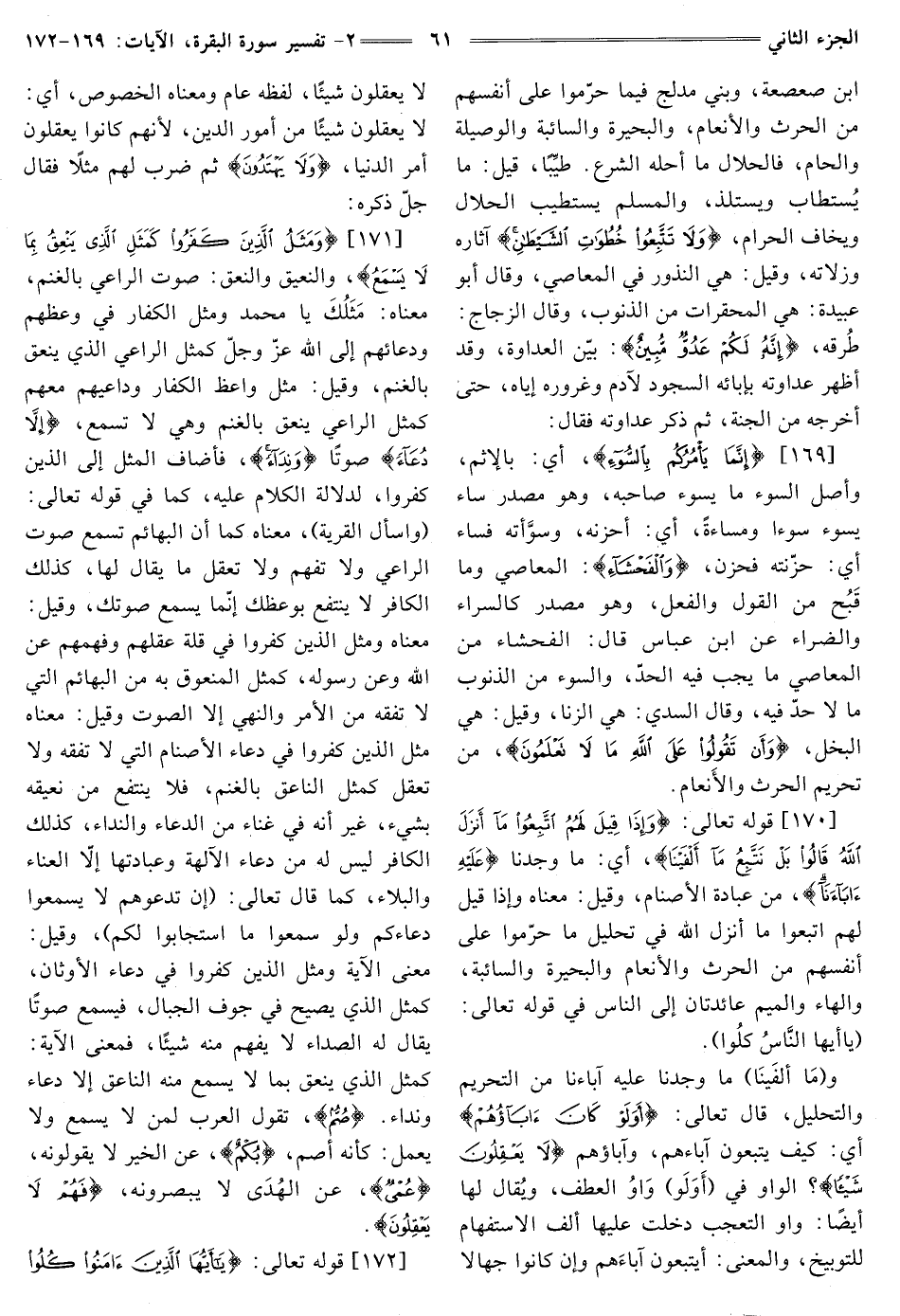 [170] قَوْلُهُ تَعَالَى: {وَإِذَا قِيلَ لَهُمُ اتَّبِعُوا مَا أَنْزَلَ اللَّهُ قَالُوا بَلْ نَتَّبِعُ مَا أَلْفَيْنَا} [البقرة: 170] أَيْ: مَا وَجَدْنَا {عَلَيْهِ آبَاءَنَا} [البقرة: 170] مِنْ عِبَادَةِ الْأَصْنَامِ، وَقِيلَ: مَعْنَاهُ وَإِذَا قِيلَ لَهُمُ اتَّبِعُوا مَا أَنْزَلَ اللَّهُ فِي تَحْلِيلِ مَا حَرَّمُوا عَلَى أَنْفُسِهِمْ مِنَ الْحَرْثِ وَالْأَنْعَامِ وَالْبَحِيرَةِ وَالسَّائِبَةِ، وَالْهَاءُ وَالْمِيمُ عائدتان إِلَى النَّاسِ فِي قَوْلِهِ تَعَالَى: {يا أَيُّهَا النَّاسُ كُلُوا} [البقرة: 168]