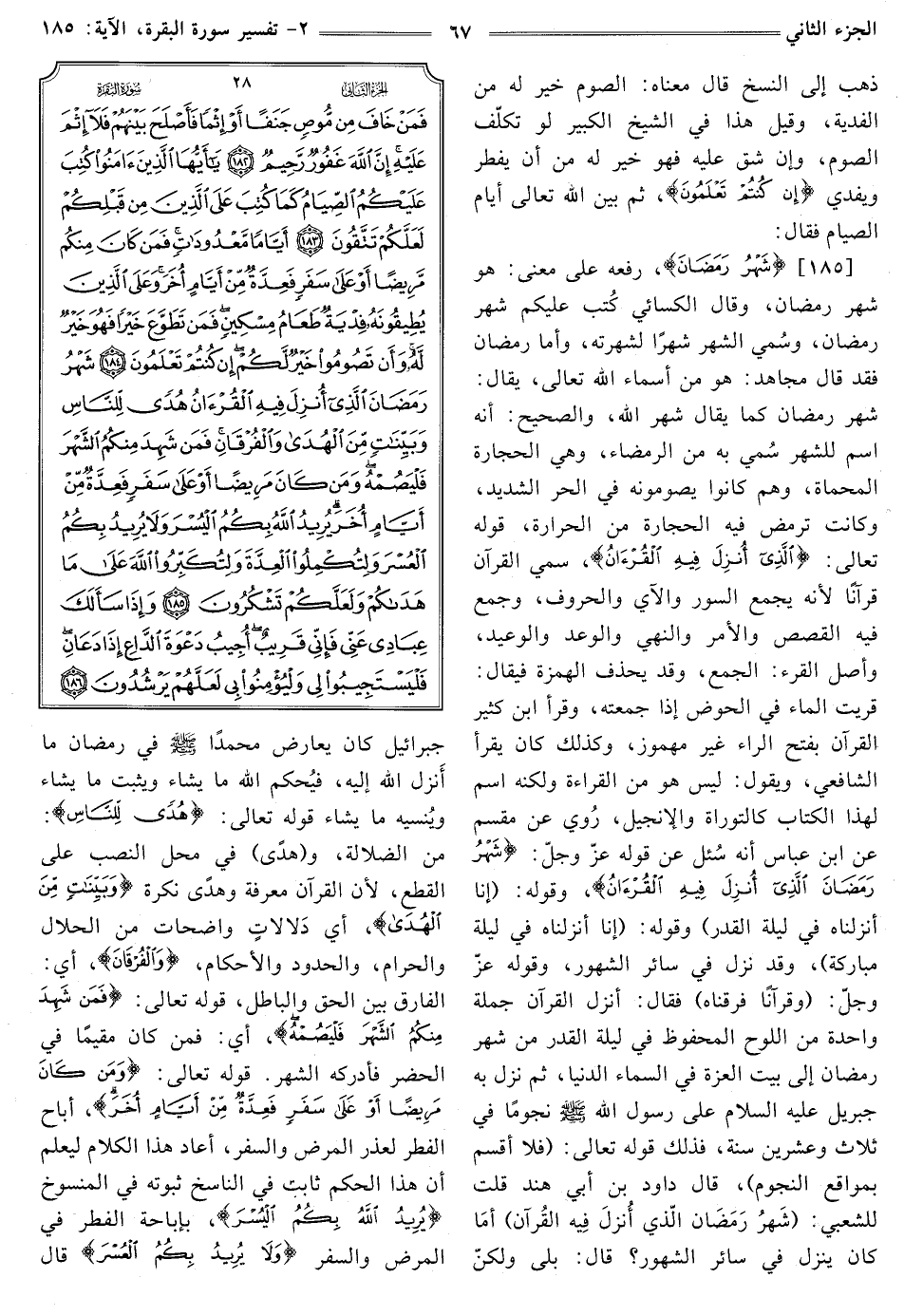 [185] {شَهْرُ رَمَضَانَ} [البقرة: 185] رَفْعُهُ عَلَى مَعْنَى: هُوَ شَهْرُ رَمَضَانَ، وَقَالَ الْكِسَائِيُّ كُتب عَلَيْكُمْ شَهْرُ رَمَضَانَ، وسُمي الشَّهْرُ شَهْرًا لِشُهْرَتِهِ، وَأَمَّا رَمَضَانُ فَقَدْ قَالَ مجاهد: هو مِنْ أَسْمَاءِ اللَّهِ تَعَالَى، يُقَالُ: شَهْرُ رَمَضَانَ كَمَا يُقَالُ شَهْرُ اللَّهِ، وَالصَّحِيحُ: أَنَّهُ اسْمٌ لِلشَّهْرِ سُمي بِهِ مِنَ الرَّمْضَاءِ، وَهِيَ الْحِجَارَةُ الْمُحْمَاةُ، وَهُمْ كَانُوا يَصُومُونَهُ في الحر الشديد، وكانت ترمض فيه الحجارة من الْحَرَارَةِ، قَوْلُهُ تَعَالَى: {الَّذِي أُنْزِلَ فِيهِ الْقُرْآنُ} [البقرة: 185] سُمِّيَ الْقُرْآنُ قُرْآنًا لِأَنَّهُ يَجْمَعُ السُّوَرَ وَالْآيَ وَالْحُرُوفَ، وَجُمِعَ فِيهِ الْقَصَصُ وَالْأَمْرُ وَالنَّهْيُ وَالْوَعْدُ وَالْوَعِيدُ، وَأَصْلُ القَرْء: الْجَمْعُ، وَقَدْ يُحْذَفُ الهمزة فَيُقَالُ: قَرَيْتَ الْمَاءَ فِي الْحَوْضِ إِذَا جَمَعْتَهُ، وَقَرَأَ ابْنُ كَثِيرٍ القرَان بِفَتْحِ الرَّاءِ غَيْرَ مَهْمُوزٍ، وَكَذَلِكَ كَانَ يَقْرَأُ الشَّافِعِيُّ، وَيَقُولُ: لَيْسَ هُوَ مِنَ الْقِرَاءَةِ وَلَكِنَّهُ اسْمٌ لِهَذَا الْكِتَابِ كَالتَّوْرَاةِ وَالْإِنْجِيلِ، رُوي عَنْ مِقْسَمٍ عَنِ ابْنِ عَبَّاسٍ أَنَّهُ سُئل عَنْ قَوْلِهِ عَزَّ وَجَلَّ: {شَهْرُ رَمَضَانَ الَّذِي أُنْزِلَ فِيهِ الْقُرْآنُ} [البقرة: 185] وَقَوْلِهِ: {إِنَّا أَنْزَلْنَاهُ فِي لَيْلَةِ الْقَدْرِ} [الْقَدْرِ: 1] وَقَوْلِهِ: {إِنَّا أَنْزَلْنَاهُ فِي لَيْلَةٍ مُبَارَكَةٍ} [الدُّخَانِ: 3] وَقَدْ نزل في سائر الشهور، وقوله عَزَّ وَجَلَّ: {وَقُرْآنًا فَرَقْنَاهُ} [الْإِسْرَاءِ: 106] فَقَالَ: أُنْزِلُ الْقُرْآنُ جُمْلَةً وَاحِدَةً مِنَ اللَّوْحِ الْمَحْفُوظِ فِي لَيْلَةِ الْقَدْرِ مِنْ شَهْرِ رَمَضَانَ إِلَى بَيْتِ الْعِزَّةِ فِي السَّمَاءِ الدُّنْيَا، ثُمَّ نَزَلَ بِهِ جِبْرِيلُ - عَلَيْهِ السَّلَامُ - عَلَى رَسُولِ اللَّهِ - صَلَّى اللَّهُ عَلَيْهِ وَسَلِّم - نُجُومًا فِي ثَلَاثٍ وَعِشْرِينَ سَنَةً، فَذَلِكَ قَوْلُهُ تَعَالَى: {فَلَا أُقْسِمُ بِمَوَاقِعِ النُّجُومِ} [الْوَاقِعَةِ: 75] قَالَ دَاوُدُ بْنُ أَبِي هِنْدٍ قُلْتُ لِلشَّعْبِيِّ: {شَهْرُ رَمَضَانَ الَّذِي أُنْزِلَ فِيهِ الْقُرْآنُ} [البقرة: 185] أمَا كَانَ يَنْزِلُ فِي سَائِرِ الشُّهُورِ؟ قَالَ: بَلَى وَلَكِنْ جَبْرَائِيلُ كَانَ يُعَارِضُ مُحَمَّدًا - صَلَّى اللَّهُ عَلَيْهِ وَسَلِّم - فِي رَمَضَانَ مَا أَنزل الله إِلَيْهِ، فيُحكم اللَّهُ مَا يَشَاءُ وَيُثْبِتُ مَا يَشَاءُ ويُنسيه مَا يشاء قوله تعالى: {هُدًى لِلنَّاسِ} [البقرة: 185] من الضلالة، و (هدًى) في محل النصب عَلَى الْقَطْعِ، لِأَنَّ الْقُرْآنَ مَعْرِفَةٌ وَهُدًى نَكِرَةٌ {وَبَيِّنَاتٍ مِنَ الْهُدَى} [البقرة: 185] أَيْ دَلالاتٍ وَاضِحَاتٍ مِنَ الْحَلَالِ والحرام، والحدود والأحكام، {وَالْفُرْقَانِ} [البقرة: 185] أَيِ: الْفَارِقِ بَيْنَ الْحَقِّ وَالْبَاطِلِ، قَوْلُهُ تَعَالَى: {فَمَنْ شَهِدَ مِنْكُمُ الشَّهْرَ فَلْيَصُمْهُ} [البقرة: 185] أَيْ: فَمَنْ كَانَ مُقِيمًا فِي الحضر فأدركه الشهر. قَوْلُهُ تَعَالَى: {وَمَنْ كَانَ مَرِيضًا أَوْ عَلَى سَفَرٍ فَعِدَّةٌ مِنْ أَيَّامٍ أُخَرَ} [البقرة: 185] أَبَاحَ الْفِطْرَ لِعُذْرِ الْمَرَضِ وَالسَّفَرِ، أعاد هَذَا الْكَلَامَ لِيُعْلَمَ أَنَّ هَذَا الْحُكْمَ ثَابِتٌ فِي النَّاسِخِ ثُبُوتَهُ في المنسوخ {يُرِيدُ اللَّهُ بِكُمُ الْيُسْرَ} [البقرة: 185] بِإِبَاحَةِ الْفِطْرِ فِي الْمَرَضِ وَالسَّفَرِ {وَلَا يُرِيدُ بِكُمُ الْعُسْرَ} [الْبَقَرَةِ: 185] قال