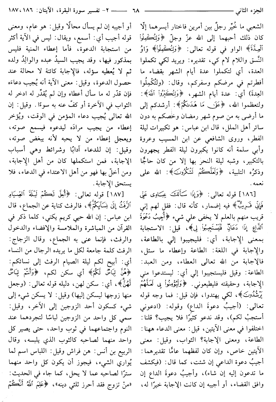 [186] قَوْلُهُ تَعَالَى: {وَإِذَا سَأَلَكَ عِبَادِي عَنِّي فَإِنِّي قَرِيبٌ} [البقرة: 186] فيه إِضْمَارٌ، كَأَنَّهُ قَالَ: فَقُلْ لَهُمْ إِنِّي قَرِيبٌ مِنْهُمْ بِالْعِلْمِ لَا يخفى علي شيء {أُجِيبُ دَعْوَةَ الدَّاعِ إِذَا دَعَانِ فَلْيَسْتَجِيبُوا لِي} [البقرة: 186] قِيلَ: الِاسْتِجَابَةُ بِمَعْنَى الْإِجَابَةِ، أَيْ: فليجيبوا إلي بِالطَّاعَةِ، وَالْإِجَابَةُ فِي اللُّغَةِ: الطَّاعَةُ وَإِعْطَاءُ مَا سُئِلَ، فَالْإِجَابَةُ مِنَ اللَّهِ تَعَالَى الْعَطَاءُ، وَمِنَ الْعَبْدِ: الطاعة: وقيل فليستجيبوا إلي، أَيْ: لِيَسْتَدْعُوا مِنِّي الْإِجَابَةَ، وَحَقِيقَتُهُ فَلْيُطِيعُونِي. {وَلْيُؤْمِنُوا بِي لَعَلَّهُمْ يَرْشُدُونَ} [البقرة: 186] لِكَيْ يَهْتَدُوا، فَإِنْ قِيلَ: فَمَا وَجْهُ قَوْلِهِ تَعَالَى: (أُجِيبُ دَعْوَةَ الدَّاعِ) وقوله: {ادْعُونِي أَسْتَجِبْ لَكُمْ} [غافر: 60] وقد ندعو كَثِيرًا فَلَا يُجِيبُ؟ قُلْنَا: اخْتَلَفُوا فِي مَعْنَى الْآيَتَيْنِ، قِيلَ: مَعْنَى الدعاء ههنا: الطَّاعَةُ، وَمَعْنَى الْإِجَابَةِ؟ الثَّوَابُ، وَقِيلَ: مَعْنَى الْآيَتَيْنِ خَاصٌّ، وَإِنْ كَانَ لَفْظُهُمَا عَامًّا تَقْدِيرُهُمَا: أجيبُ دَعْوَةَ الداعي إِنْ شِئْتُ، كَمَا قَالَ: {فَيَكْشِفُ مَا تَدْعُونَ إِلَيْهِ إِنْ شَاءَ} [الأنعام: 41] وأجيبُ دعوةَ الداع إِنْ وَافَقَ الْقَضَاءَ، أَوْ أُجِيبُهُ إِنْ كَانَتِ الْإِجَابَةُ خَيْرًا لَهُ، أَوْ أُجِيبُهُ إِنْ لَمْ يَسْأَلْ محالًا وَقِيلَ: هُوَ عَامٌّ، وَمَعْنَى قَوْلِهِ أُجِيبُ، أَيْ: أَسْمَعُ، وَيُقَالُ. لَيْسَ في الآية أكثر من استجابة الدَّعْوَةِ، فَأَمَّا إِعْطَاءُ الْمُنْيَةِ فَلَيْسَ بِمَذْكُورٍ فِيهَا، وَقَدْ يُجِيبُ السيدُ عَبْدَهُ والوالِدُ وَلَدَهُ ثُمَّ لَا يُعطيه سُؤْلَهُ، فَالْإِجَابَةُ كَائِنَةٌ لَا مَحَالَةَ عِنْدَ حُصُولِ الدَّعْوَةِ، وَقِيلَ: معنى الآية أنه يُجيب دعاءَه فَإِنْ قَدَّرَ لَهُ مَا سأل أعطاه وإن لم يُقدِّر لَهُ ادَّخَرَ لَهُ الثَّوَابَ فِي الْآخِرَةِ أَوْ كَفَّ عَنْهُ بِهِ سوءًا. وَقِيلَ. إِنَّ اللَّهَ تَعَالَى يُجيب دُعَاءَ الْمُؤْمِنِ فِي الْوَقْتِ، ويُؤخر إعطاء من يجيب مرادَه لِيَدْعُوَهُ فَيَسْمَعَ صَوْتَهُ، وَيُعَجِّلُ إِعْطَاءَ مَنْ لَا يُحِبُّهُ لِأَنَّهُ يَبْغَضُ صَوْتَهُ، وَقِيلَ: إِنَّ لِلدُّعَاءِ آدَابًا وَشَرَائِطَ وَهِيَ أَسْبَابُ الْإِجَابَةِ، فَمَنِ اسْتَكْمَلَهَا كَانَ مِنْ أَهْلِ الْإِجَابَةِ، وَمَنْ أَخَلَّ بِهَا فَهُوَ مِنْ أَهْلِ الِاعْتِدَاءِ فِي الدُّعَاءِ، فلا يستحق الإجابة.