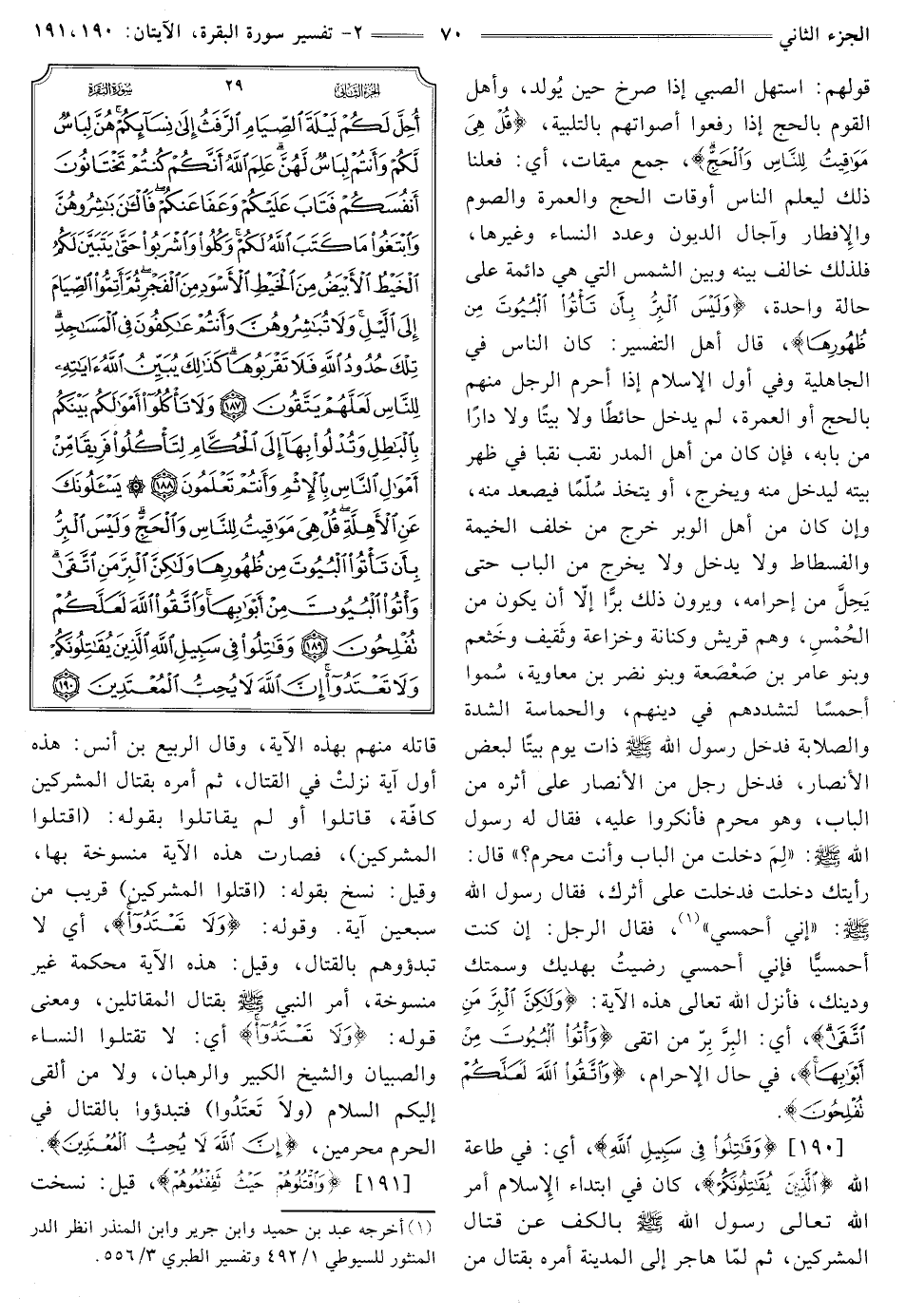 [190] {وَقَاتِلُوا فِي سَبِيلِ اللَّهِ} [البقرة: 190] أَيْ: فِي طَاعَةِ اللَّهِ {الَّذِينَ يُقَاتِلُونَكُمْ} [البقرة: 190] كَانَ فِي ابْتِدَاءِ الْإِسْلَامِ أَمَرَ الله تعالى رَسُولِ اللَّهِ - صَلَّى اللَّهُ عَلَيْهِ وَسَلِّم - بِالْكَفِّ عَنْ قِتَالِ الْمُشْرِكِينَ، ثُمَّ لَمَّا هَاجَرَ إِلَى الْمَدِينَةِ أَمَرَهُ بِقِتَالِ مَنْ قَاتَلَهُ مِنْهُمْ بِهَذِهِ الْآيَةِ، وَقَالَ الرَّبِيعُ بْنُ أَنَسٍ: هَذِهِ أَوَّلُ آيَةٍ نزلتْ فِي الْقِتَالِ، ثُمَّ أَمَرَهُ بِقِتَالِ الْمُشْرِكِينَ كَافَّةً، قَاتَلُوا أَوْ لَمْ يقاتلوا بقوله: (اقتلوا الْمُشْرِكِينَ) ، فَصَارَتْ هَذِهِ الْآيَةُ مَنْسُوخَةً بها، وقيل: نسخ بقوله: (اقتلوا الْمُشْرِكِينَ) قَرِيبٌ مِنْ سَبْعِينَ آيَةً. وقوله: {وَلَا تَعْتَدُوا} [البقرة: 190] أي لا تبدؤوهم بِالْقِتَالِ، وَقِيلَ: هَذِهِ الْآيَةُ مُحْكَمَةٌ غَيْرُ مَنْسُوخَةٍ، أُمِرَ النَّبِيُّ - صَلَّى اللَّهُ عَلَيْهِ وَسَلِّم - بِقِتَالِ الْمُقَاتِلِينَ، وَمَعْنَى قَوْلِهِ: وَلَا تَعْتَدُوا، أَيْ: لَا تَقْتُلُوا النِّسَاءَ وَالصِّبْيَانَ وَالشَّيْخَ الْكَبِيرَ وَالرُّهْبَانَ، وَلَا مَنْ أَلْقَى إليكم السلام (ولاَ تَعتَدُوا) فَتَبْدَءُوا بِالْقِتَالِ فِي الْحَرَمِ مُحْرِمِينَ، {إِنَّ اللَّهَ لَا يُحِبُّ الْمُعْتَدِينَ} [البقرة: 190]