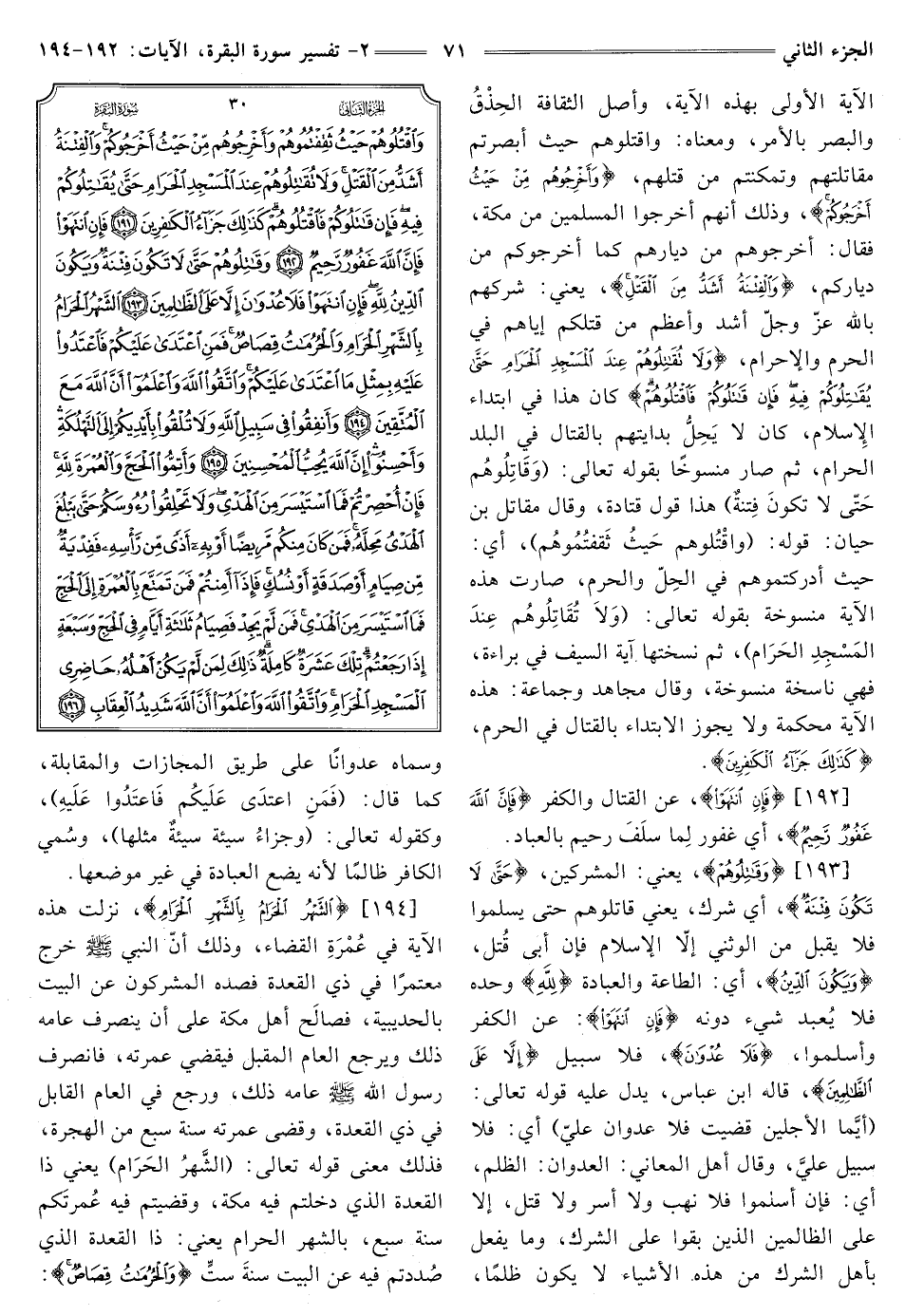 [194] {الشَّهْرُ الْحَرَامُ بِالشَّهْرِ الْحَرَامِ} [البقرة: 194] نزلت هذه الآية فِي عُمْرَةِ الْقَضَاءِ، وَذَلِكَ أَنَّ النَّبِيُّ - صَلَّى اللَّهُ عَلَيْهِ وَسَلَّمَ - خَرَجَ مُعْتَمِرًا فِي ذِي الْقِعْدَةِ فَصَدَّهُ الْمُشْرِكُونَ عَنِ الْبَيْتِ بِالْحُدَيْبِيَةِ, فصالَح أَهْلَ مَكَّةَ عَلَى أَنْ يَنْصَرِفَ عَامَهُ ذَلِكَ وَيَرْجِعَ الْعَامَ المقبل فَيَقْضِيَ عُمْرَتَهُ، فَانْصَرَفَ رَسُولُ اللَّهِ - صَلَّى اللَّهُ عَلَيْهِ وَسَلَّمَ - عَامَهُ ذَلِكَ، وَرَجَعَ فِي الْعَامِ الْقَابِلِ فِي ذِي الْقِعْدَةِ، وَقَضَى عُمْرَتَهُ سَنَةَ سَبْعٍ مِنَ الْهِجْرَةِ، فَذَلِكَ مَعْنَى قَوْلِهِ تَعَالَى: (الشَّهْرُ الْحَرَامُ) ، يَعْنِي ذَا الْقِعْدَةِ الَّذِي دَخَلْتُمْ فِيهِ مَكَّةَ، وَقَضَيْتُمْ فِيهِ عُمرتكم سَنَةَ سَبْعٍ, بِالشَّهْرِ الْحَرَامِ، يَعْنِي: ذَا الْقِعْدَةِ الَّذِي صُددتم فِيهِ عَنِ الْبَيْتِ سَنَةَ سِتٍّ {وَالْحُرُمَاتُ قِصَاصٌ} [البقرة: 194]