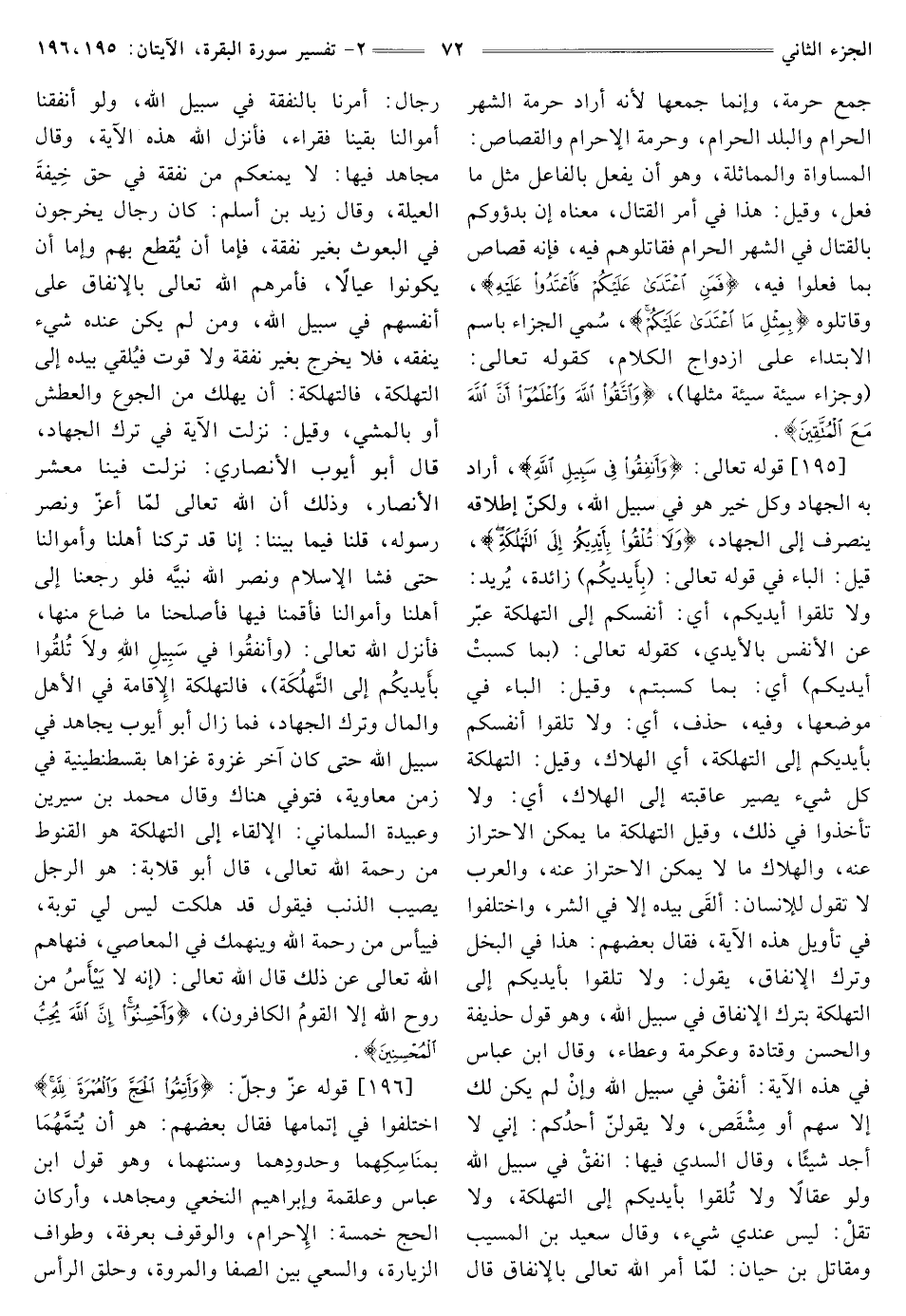 [195] قَوْلُهُ تَعَالَى: {وَأَنْفِقُوا فِي سَبِيلِ اللَّهِ} [البقرة: 195] أَرَادَ بِهِ الْجِهَادَ وَكُلَّ خَيْرٍ هُوَ فِي سَبِيلِ اللَّهِ، وَلَكِنَّ إِطْلَاقَهُ يَنْصَرِفُ إِلَى الْجِهَادِ، {وَلَا تُلْقُوا بِأَيْدِيكُمْ إِلَى التَّهْلُكَةِ} [الْبَقَرَةِ: 195] قِيلَ: الْبَاءُ فِي قَوْلِهِ تَعَالَى: {بِأَيديكُم} [البقرة: 195] زَائِدَةٌ، يُريد: وَلَا تُلْقُوا أَيْدِيَكُمْ، أَيْ: أَنْفُسَكُمْ إِلَى التَّهْلُكَةِ عَبَّرَ عن الأنفس بالأيدي، كقوله تعالى: {فَبِمَا كَسَبَتْ أَيْدِيكُمْ} [الشُّورَى: 30] أَيْ: بِمَا كَسَبْتُمْ، وَقِيلَ: الْبَاءُ فِي مَوْضِعِهَا، وفيه، حذف، أي: ولا تُلْقُوا أَنْفُسَكُمْ بِأَيْدِيكُمْ إِلَى التَّهْلُكَةِ، أَيِ الْهَلَاكِ، وَقِيلَ: التَّهْلُكَةُ كُلُّ شَيْءٍ يَصِيرُ عَاقِبَتُهُ إِلَى الْهَلَاكِ، أَيْ: وَلَا تَأْخُذُوا فِي ذَلِكَ، وَقِيلَ التَّهْلُكَةُ مَا يُمْكِنُ الِاحْتِرَازُ عَنْهُ، وَالْهَلَاكُ مَا لَا يُمْكِنُ الِاحْتِرَازُ عَنْهُ، وَالْعَرَبُ لَا تَقُولُ لِلْإِنْسَانِ: ألقَى بِيَدِهِ إِلَّا فِي الشر، وَاخْتَلَفُوا فِي تَأْوِيلِ هَذِهِ الْآيَةِ، فَقَالَ بَعْضُهُمْ: هَذَا فِي الْبُخْلِ وَتَرَكِ الْإِنْفَاقِ، يَقُولُ: وَلَا تُلْقُوا بِأَيْدِيكُمْ إِلَى التَّهْلُكَةِ بِتَرْكِ الْإِنْفَاقِ فِي سَبِيلِ اللَّهِ، وَهُوَ قَوْلُ حُذَيْفَةَ وَالْحَسَنِ وَقَتَادَةَ وَعِكْرِمَةَ وَعَطَاءٍ، وَقَالَ ابْنُ عَبَّاسٍ فِي هَذِهِ الْآيَةِ: أنفقْ فِي سَبِيلِ اللَّهِ وإنْ لَمْ يَكُنْ لَكَ إِلَّا سَهْمٌ أَوْ مِشْقَص، وَلَا يَقُولَنَّ أحدُكم: إِنِّي لَا أَجِدُ شَيْئًا، وقال السدي فيها: أنفقْ فِي سَبِيلِ اللَّهِ وَلَوْ عِقَالًا وَلَا تُلقوا بِأَيْدِيكُمْ إِلَى التَّهْلُكَةِ، وَلَا تقلْ: لَيْسَ عِنْدِي شَيْءٌ، وَقَالَ سَعِيدُ بْنُ الْمُسَيَّبِ وَمُقَاتِلُ بْنُ حَيَّانَ: لَمَّا أَمَرَ الله تعالى بالإنفاق قال رجال: أُمِرْنَا بِالنَّفَقَةِ فِي سَبِيلِ اللَّهِ، وَلَوْ أَنْفَقْنَا أَمْوَالَنَا بَقِينَا فُقَرَاءَ، فَأَنْزَلَ اللَّهُ هَذِهِ الْآيَةَ، وَقَالَ مجاهد فيها: لا يمنعكم مِنْ نَفَقَةٍ فِي حَقٍّ خِيفةَ العيلة، وَقَالَ زَيْدُ بْنُ أَسْلَمَ: كَانَ رِجَالٌ يَخْرُجُونَ فِي الْبُعُوثِ بِغَيْرِ نَفَقَةٍ، فَإِمَّا أَنْ يُقطع بِهِمْ وإما أن يكونوا عِيَالًا، فَأَمَرَهُمُ اللَّهُ تَعَالَى بِالْإِنْفَاقِ عَلَى أَنْفُسِهِمْ فِي سَبِيلِ اللَّهِ، وَمَنْ لَمْ يَكُنْ عِنْدَهُ شَيْءٌ يُنْفِقُهُ، فَلَا يَخْرُجُ بِغَيْرِ نَفَقَةٍ وَلَا قُوتٍ فيُلقي بِيَدِهِ إِلَى التَّهْلُكَةِ، فَالتَّهْلُكَةُ: أَنْ يَهْلِكَ مِنَ الْجُوعِ وَالْعَطَشِ أَوْ بِالْمَشْيِ، وَقِيلَ: نزلت الْآيَةُ فِي تَرْكِ الْجِهَادِ، قَالَ أَبُو أَيُّوبَ الْأَنْصَارِيُّ: نَزَلَتْ فِينَا مَعْشَرَ الْأَنْصَارِ، وَذَلِكَ أَنَّ اللَّهَ تعالى لمّا أعزّ وَنَصَرَ رَسُولَهُ، قُلْنَا فِيمَا بَيْنَنَا: إِنَّا قَدْ تَرَكْنَا أَهْلَنَا وَأَمْوَالَنَا حَتَّى فَشَا الْإِسْلَامُ وَنَصَرَ اللَّهُ نبيَّه فلو رجعنا إلى أهلنا وَأَمْوَالِنَا فَأَقَمْنَا فِيهَا فَأَصْلَحْنَا مَا ضَاعَ مِنْهَا، فَأَنْزَلَ اللَّهُ تَعَالَى: {وَأَنْفِقُوا فِي سَبِيلِ اللَّهِ وَلَا تُلْقُوا بِأَيْدِيكُمْ إِلَى التَّهْلُكَةِ} [الْبَقَرَةِ: 195] فَالتَّهْلُكَةُ الْإِقَامَةُ فِي الْأَهْلِ وَالْمَالِ وَتَرْكُ الْجِهَادِ، فَمَا زَالَ أَبُو أَيُّوبَ يُجَاهِدُ فِي سَبِيلِ اللَّهِ حَتَّى كَانَ آخِرُ غَزْوَةٍ غَزَاهَا بِقُسْطَنْطِينِيَّةَ فِي زَمَنِ مُعَاوِيَةَ، فَتُوُفِّيَ هناك وَقَالَ مُحَمَّدُ بْنُ سِيرِينَ وَعَبِيدَةُ السَّلْمَانِيُّ: الْإِلْقَاءُ إِلَى التَّهْلُكَةِ هُوَ الْقُنُوطُ مِنْ رَحْمَةِ اللَّهِ تَعَالَى، قَالَ أَبُو قِلَابَةَ: هُوَ الرَّجُلُ يُصِيبُ الذَّنْبَ ف