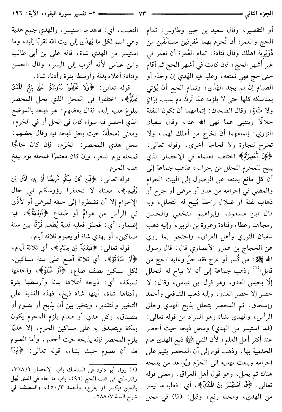 أو التقصير، وَقَالَ سَعِيدُ بْنُ جُبَيْرٍ وَطَاوُسٌ: تَمَامُ الْحَجِّ وَالْعُمْرَةِ أَنْ تُحرم بهما مُفردَين مستأنَفَين من دُوَيْرِية أهلك وَقَالَ قَتَادَةُ: تَمَامُ العُمرة أَنْ تعمر فِي غَيْرِ أَشْهُرِ الْحَجِّ، فَإِنْ كَانَتْ فِي أَشْهُرِ الْحَجِّ ثُمَّ أقام حتى حج فهي تمتعه، وعليه فيه الهَدي إِنْ وجدَه أَوِ الصِّيَامُ إنْ لَمْ يجِد الهَدْي، وَتَمَامُ الْحَجِّ أَنْ يُؤتي بِمَنَاسِكِهِ كُلِّهَا حتى لا يلزمه عمّا تَركَ دَمٌ بِسَبَبِ قِرَانٍ وَلَا متْعَةِ، وقال الضحاك: إتمامهما أَنْ تَكُونَ النَّفَقَةُ حَلَالًا وَيَنْتَهِيَ عَمَّا نَهَى اللَّهُ عَنْهُ، وَقَالَ سفيان الثوري: إتمامهما أَنْ تَخْرُجَ مِنْ أَهْلِكَ لَهُمَا، وَلَا تَخْرُجَ لِتِجَارَةٍ وَلَا لِحَاجَةٍ أخرى. وقوله تعالى: {فَإِنْ أُحْصِرْتُمْ} [البقرة: 196] اخْتَلَفَ الْعُلَمَاءُ فِي الإحْصَارِ الَّذِي يُبِيحُ لِلْمُحْرِمِ التَّحَلُّلَ مِنْ إِحْرَامِهِ، فَذَهَبَ جَمَاعَةٌ إِلَى أَنَّ كُلَّ مَانِعٍ يَمْنَعُهُ عَنِ الْوُصُولِ إِلَى البيت الحرام والمضي فِي إِحْرَامِهِ مِنْ عَدُوٍّ أَوْ مَرَضٍ أَوْ جُرْحٍ أَوْ ذَهَابِ نَفَقَةٍ أَوْ ضَلَالِ رَاحِلَةٍ يُبيح لَهُ التَّحَلُّلَ، وَبِهِ قَالَ ابْنُ مسعود، وإبراهيم النَّخَعِيِّ وَالْحَسَنِ وَمُجَاهِدٍ وَعَطَاءٍ وَقَتَادَةَ وَعُرْوَةَ بْنِ الزُّبَيْرِ، وَإِلَيْهِ ذَهَبَ سفيان الثوري وأهل العراق، واحتجوا بما روي عَنِ الْحَجَّاجِ بْنِ عَمْرٍو الْأَنْصَارِيِّ قَالَ: قَالَ رَسُولُ اللَّهِ صَلَّى اللَّهُ عَلَيْهِ وَسَلَّمَ: «مَنْ كُسر أَوْ عَرِجَ فَقَدْ حَلَّ وَعَلَيْهِ الحج من قابل» (¬1) وَذَهَبَ جَمَاعَةٌ إِلَى أَنَّهُ لَا يباح له التحليل إلَّا بِحَبْسِ الْعَدُوِّ، وَهُوَ قَوْلُ ابْنِ عَبَّاسٍ، وَقَالَ: لَا حَصْرَ إلا حصر العدو، وَإِلَيْهِ ذَهَبَ الشَّافِعِيُّ وَأَحْمَدُ وَإِسْحَاقُ. ثُمَّ الْمُحْصَرُ يَتَحَلَّلُ بِذَبْحِ الْهَدْيِ وحلق الرأس، والهدي بشاة وَهُوَ الْمُرَادُ مِنْ قَوْلِهِ تَعَالَى: {فَمَا اسْتَيْسَرَ مِنَ الْهَدْيِ} [البقرة: 196] وَمَحِلُّ ذَبْحِهِ حَيْثُ أُحْصِرَ عِنْدَ أَكْثَرِ أَهْلِ الْعِلْمِ، لِأَنَّ النَّبِيَّ - صَلَّى اللَّهُ عَلَيْهِ وَسَلَّمَ - ذَبَحَ الْهَدْيَ عَامَ الْحُدَيْبِيَةِ بِهَا، وَذَهَبَ قَوْمٌ إِلَى أَنَّ الْمُحْصَرَ يُقِيمُ عَلَى إِحْرَامِهِ وَيَبْعَثُ بِهَدْيِهِ إِلَى الحَرَم ويُواعد مَنْ يَذْبَحُهُ هُنَاكَ ثُمَّ يَحِلُّ، وَهُوَ قَوْلُ أَهْلِ العراق. ومعنى قَوْلِهِ تَعَالَى: فَمَا اسْتَيْسَرَ مِنَ الْهَدْيِ، أَيْ: فَعَلَيْهِ مَا تَيَسَّرَ مِنَ الْهَدْيِ، وَمَحَلُّهُ رَفْعٌ، وَقِيلَ: (مَا) فِي مَحَلِّ النَّصْبِ، أَيْ: فاهد مَا اسْتَيْسَرَ، وَالْهَدْيُ جَمْعُ هَدِيَّةٍ وَهِيَ اسْمٌ لِكُلِّ مَا يُهدَى إِلَى بَيْتِ اللَّهِ تَقَرُّبًا إِلَيْهِ، وَمَا اسْتَيْسَرَ مِنَ الْهَدْيِ شَاةٌ، قَالَهُ عَلِيُّ بْنُ أَبِي طَالِبٍ وَابْنُ عَبَّاسٍ لِأَنَّهُ أَقْرَبُ إِلَى الْيُسْرِ، وَقَالَ الْحَسَنُ وَقَتَادَةُ أَعْلَاهُ بَدَنَةٌ وَأَوْسَطُهُ بَقَرَةٌ وَأَدْنَاهُ شَاةٌ.