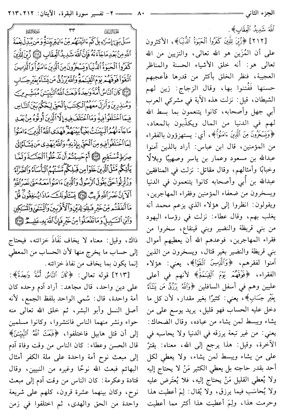 [213] قَوْلُهُ تَعَالَى: {كَانَ النَّاسُ أُمَّةً وَاحِدَةً} [البقرة: 213] عَلَى دِينٍ وَاحِدٍ، قَالَ مُجَاهِدٌ: أَرَادَ آدَمَ وَحْدَهُ كَانَ أُمَّةً وَاحِدَةً، قَالَ: سُمي الْوَاحِدُ بِلَفْظِ الْجَمْعِ، لِأَنَّهُ أَصْلُ النَّسْلِ وَأَبُو الْبَشَرِ، ثُمَّ خَلَقَ اللَّهُ تَعَالَى منه حَوَّاءَ وَنَشَرَ مِنْهُمَا النَّاسَ فَانْتَشَرُوا، وَكَانُوا مُسْلِمِينَ إِلَى أَنْ قَتَلَ هَابِيلَ فَاخْتَلَفُوا، {فَبَعَثَ اللَّهُ النَّبِيِّينَ} [البقرة: 213] قَالَ الْحَسَنُ وَعَطَاءٌ: كَانَ النَّاسُ مِنْ وَقْتِ وَفَاةِ آدَمَ إِلَى مَبْعَثِ نُوحٍ أُمَّةً وَاحِدَةً عَلَى مِلَّةِ الْكُفْرِ أَمْثَالَ الْبَهَائِمِ فَبَعَثَ اللَّهُ نُوحًا وَغَيْرَهُ مِنَ النَّبِيِّينَ، وَقَالَ قَتَادَةُ وَعِكْرِمَةُ: كَانَ النَّاسُ مِنْ وَقْتِ آدَمَ إِلَى مَبْعَثِ نُوحٍ، وَكَانَ بَيْنَهُمَا عَشَرَةُ قُرُونٍ، كُلُّهُمْ عَلَى شَرِيعَةٍ وَاحِدَةٍ مِنَ الْحَقِّ وَالْهُدَى، ثُمَّ اخْتَلَفُوا فِي زَمَنِ