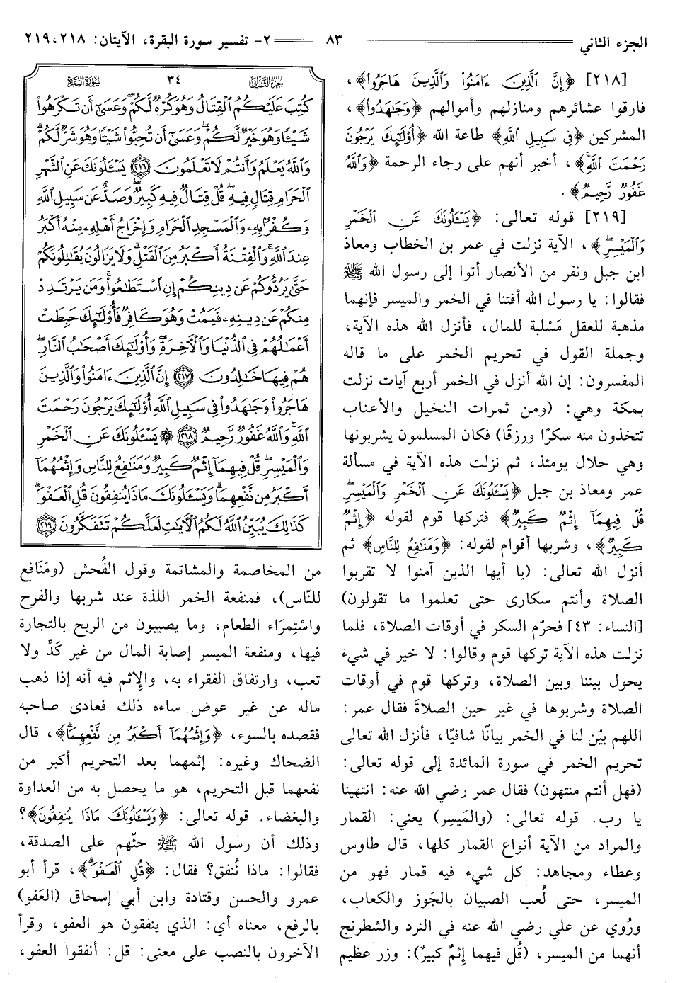 [219] قَوْلُهُ تَعَالَى: {يَسْأَلُونَكَ عَنِ الْخَمْرِ وَالْمَيْسِرِ} [البقرة: 219] الْآيَةَ نَزَلَتْ فِي عُمَرَ بْنِ الخطاب ومعاذ بن جبل وَنَفَرٍ مِنَ الْأَنْصَارِ أَتَوْا إِلَى رَسُولِ اللَّهِ صَلَّى اللَّهُ عَلَيْهِ وَسَلَّمَ فَقَالُوا: يَا رَسُولَ اللَّهِ أَفْتِنَا فِي الْخَمْرِ وَالْمَيْسِرِ فَإِنَّهُمَا مَذْهَبَةٌ لِلْعَقْلِ مَسْلبة لِلْمَالِ، فَأَنْزَلَ اللَّهُ هَذِهِ الْآيَةَ، وَجُمْلَةُ الْقَوْلِ فِي تَحْرِيمِ الْخَمْرِ عَلَى مَا قاله الْمُفَسِّرُونَ: أَنَّ اللَّهَ أَنْزَلَ فِي الْخَمْرِ أَرْبَعَ آيَاتٍ نَزَلَتْ بِمَكَّةَ وَهِيَ: {وَمِنْ ثَمَرَاتِ النَّخِيلِ وَالْأَعْنَابِ تَتَّخِذُونَ مِنْهُ سَكَرًا وَرِزْقًا} [النَّحْلِ: 67] فَكَانَ الْمُسْلِمُونَ يَشْرَبُونَهَا وَهِيَ حلال يومئذ، ثم نزلت هذه الآية فِي مَسْأَلَةِ عُمْرَ وَمُعَاذِ بْنِ جَبَلٍ {يَسْأَلُونَكَ عَنِ الْخَمْرِ وَالْمَيْسِرِ قُلْ فِيهِمَا إِثْمٌ كَبِيرٌ} [البقرة: 219] فَتَرَكَهَا قَوْمٌ لِقَوْلِهِ {إِثْمٌ كَبِيرٌ} [البقرة: 219] وشربها أقوام لقوله: {وَمَنَافِعُ لِلنَّاسِ} [البقرة: 219] ثم أنزل اللَّهُ تَعَالَى: {يَا أَيُّهَا الَّذِينَ آمَنُوا لَا تَقْرَبُوا الصَّلَاةَ وَأَنْتُمْ سُكَارَى حَتَّى تَعْلَمُوا مَا تَقُولُونَ} [النِّسَاءِ: 43] فَحَرَّمَ السُّكْرَ فِي أَوْقَاتِ الصَّلَاةِ، فَلَمَّا نَزَلَتْ هَذِهِ الْآيَةُ تَرَكَهَا قَوْمٌ وَقَالُوا: لَا خَيْرَ فِي شَيْءٍ يَحُولُ بَيْنَنَا وَبَيْنَ الصَّلَاةِ، وَتَرَكَهَا قَوْمٌ فِي أَوْقَاتِ الصَّلَاةِ وَشَرِبُوهَا فِي غَيْرِ حِينِ الصلاةَ فَقَالَ عُمَرُ: اللَّهُمَّ بَيِّنْ لَنَا فِي الْخَمْرِ بَيَانًا شَافِيًا، فَأَنْزَلَ اللَّهُ تَعَالَى تَحْرِيمَ الْخَمْرِ فِي سورة المائدة إلى قوله تَعَالَى: {فَهَلْ أَنْتُمْ مُنْتَهُونَ} [الْمَائِدَةِ: 91] فَقَالَ عُمْرُ رَضِيَ اللَّهُ عَنْهُ: انتهينا يا رب. قَوْلُهُ تَعَالَى: (والمَيسِر) ، يَعْنِي: الْقِمَارَ وَالْمُرَادُ مِنَ الْآيَةِ أَنْوَاعُ الْقِمَارِ كلها، قال طاوس وَعَطَاءٌ وَمُجَاهِدٌ: كُلُّ شَيْءٍ فِيهِ قِمَارٌ فَهُوَ مِنَ الْمَيْسِرِ، حَتَّى لُعب الصِّبْيَانِ بالجَوز وَالْكِعَابِ، ورُوي عَنْ عَلِيٍّ - رَضِيَ اللَّهُ عَنْهُ - فِي النَّرْدِ وَالشِّطْرَنْجِ أَنَّهُمَا مِنَ الميسر، (قُلْ فِيهِمَا إِثْمٌ كَبِيرٌ) : وِزْرٌ عَظِيمٌ مِنَ الْمُخَاصَمَةِ وَالْمُشَاتَمَةِ وَقَوْلِ الفُحش (ومَنَافع لِلنَّاسِ) ، فَمَنْفَعَةُ الْخَمْرِ اللَّذَّةُ عِنْدَ شُرْبِهَا وَالْفَرَحُ واسْتمرَاء الطَّعَامِ، وَمَا يُصِيبُونَ مِنَ الرِّبْحِ بِالتِّجَارَةِ فِيهَا، وَمَنْفَعَةُ الْمَيْسِرِ إِصَابَةُ الْمَالِ مِنْ غَيْرِ كَدّ وَلَا تَعَبٍ، وَارْتِفَاقُ الْفُقَرَاءِ بِهِ، وَالْإِثْمُ فِيهِ أنه إذا ذهب ماله عن غَيْرِ عِوَضٍ سَاءَهُ ذَلِكَ فَعَادَى صَاحِبَهُ فَقَصَدَهُ بِالسُّوءِ، {وَإِثْمُهُمَا أَكْبَرُ مِنْ نَفْعِهِمَا} [البقرة: 219] قَالَ الضَّحَّاكُ وَغَيْرُهُ: إِثْمُهُمَا بَعْدَ التَّحْرِيمِ أَكْبَرُ مِنْ نَفْعِهِمَا قَبْلَ التحريم، هو ما يحصل به مِنَ الْعَدَاوَةِ وَالْبَغْضَاءِ. قَوْلُهُ تَعَالَى: {وَيَسْأَلُونَكَ مَاذَا يُنْفِقُونَ} [البقرة: 219] ؟ وَذَلِكَ أَنَّ رَسُولَ اللَّهِ - صَلَّى اللَّهُ عَلَيْهِ وَسَلَّمَ - حَثَّهُمْ عَلَى الصَّدَقَةِ، فَقَالُوا: مَاذَا نُنفق؟ فَقَالَ: {قُلِ الْعَفْوَ} [البقرة: 219] قرأ أبو عمرو والحسن وقتادة وابن أبي إسحاق (العَفو) بالرفع، معناه أي: الَّذِي يُنْفِقُونَ هُوَ الْعَفْوُ، وَقَرَأَ الْآخَرُونَ بِالنَّصْبِ عَلَى مَعْنَى: قُلْ: أَنْفِقُوا الْعَفْوَ,