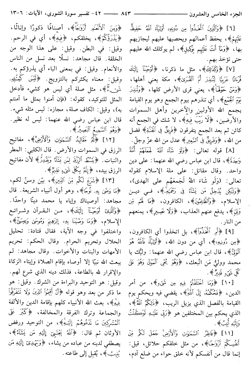 [8] قَوْلُهُ تَعَالَى: {وَلَوْ شَاءَ اللَّهُ لَجَعَلَهُمْ أُمَّةً وَاحِدَةً} [الشورى: 8] قَالَ ابْنُ عَبَّاسٍ -رَضِيَ اللَّهُ عَنْهُمَا-: عَلَى دِينٍ وَاحِدٍ. وَقَالَ مُقَاتِلٌ: عَلَى مِلَّةِ الْإِسْلَامِ كَقَوْلِهِ تَعَالَى: {وَلَوْ شَاءَ اللَّهُ لَجَمَعَهُمْ عَلَى الْهُدَى} [الْأَنْعَامِ: 35] {وَلَكِنْ يُدْخِلُ مَنْ يَشَاءُ فِي رَحْمَتِهِ} [الشورى: 8] في دين الإسلام، {وَالظَّالِمُونَ} [الشورى: 8] الْكَافِرُونَ، {مَا لَهُمْ مِنْ وَلِيٍّ} [الشورى: 8] يَدْفَعُ عَنْهُمُ الْعَذَابَ، {وَلَا نَصِيرٍ} [الشورى: 8] يَمْنَعُهُمْ مِنَ النَّارِ.