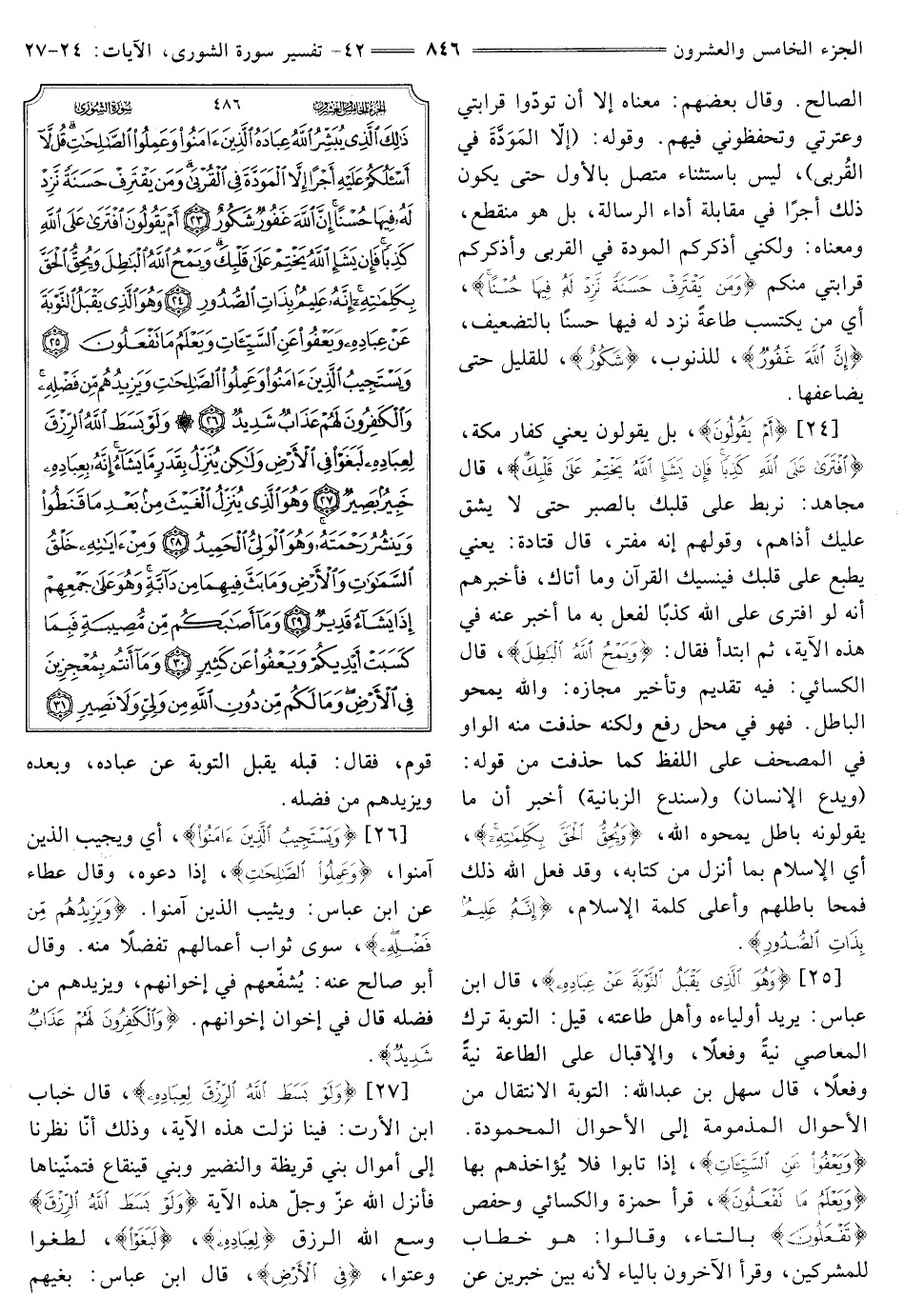 [27] {وَلَوْ بَسَطَ اللَّهُ الرِّزْقَ لِعِبَادِهِ} [الشورى: 27] قَالَ خَبَّابُ بْنُ الْأَرَتِّ: فِينَا نَزَلَتْ هَذِهِ الْآيَةُ، وَذَلِكَ أَنَّا نَظَرْنَا إِلَى أَمْوَالِ بَنِي قُرَيْظَةَ والنضير وَبَنِي قَيْنُقَاعَ فَتَمَنَّيْنَاهَا فَأَنْزَلَ اللَّهُ -عَزَّ وَجَلَّ- هَذِهِ الْآيَةَ {وَلَوْ بَسَطَ اللَّهُ الرِّزْقَ} [الشورى: 27] وسع الله الرزق {لِعِبَادِهِ} [الشورى: 27] {لَبَغَوْا} [الشورى: 27] لطغوا وعتوا، {فِي الْأَرْضِ} [الشورى: 27] قَالَ ابْنُ عَبَّاسٍ: بَغْيُهُمْ