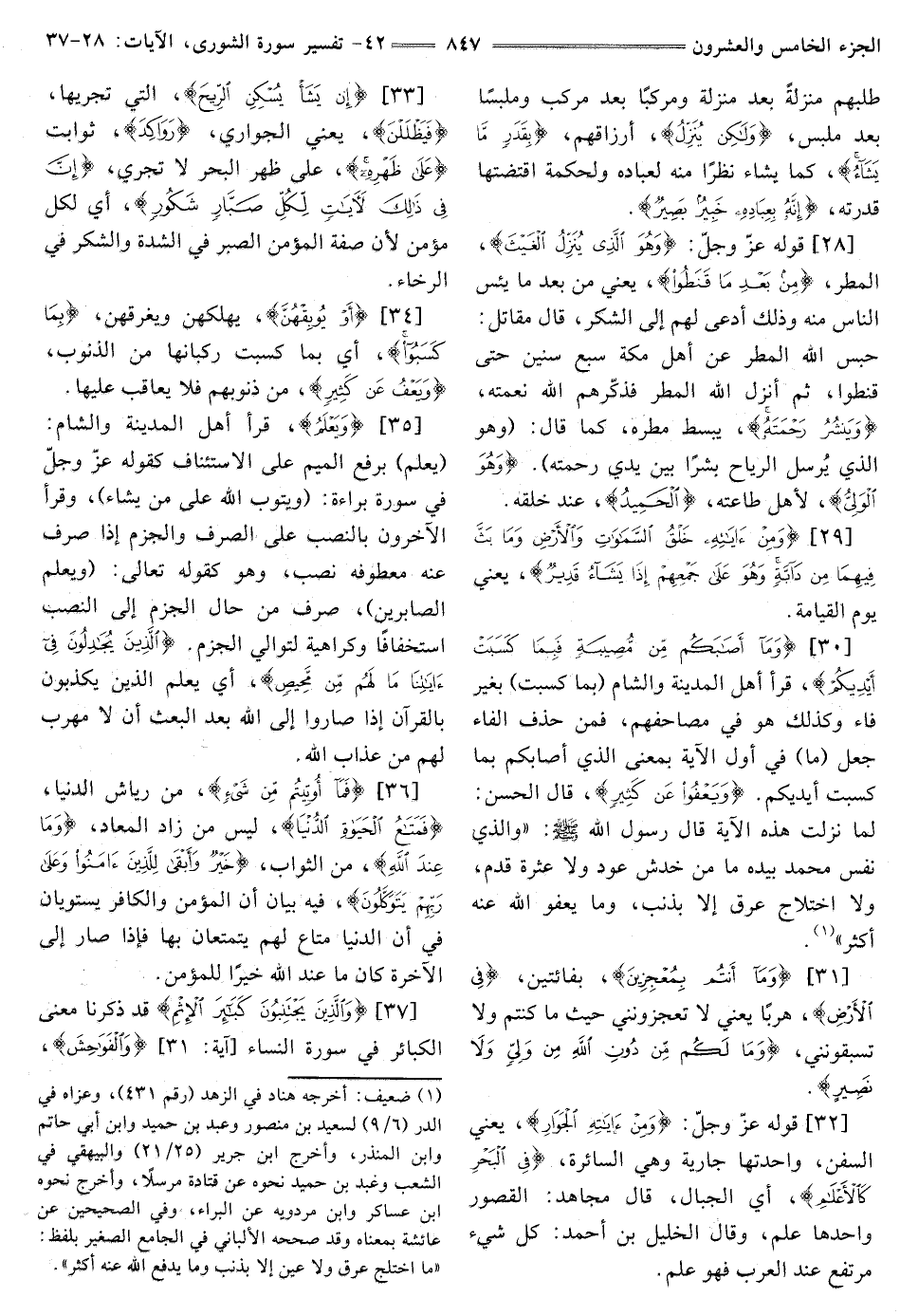 [30] {وَمَا أَصَابَكُمْ مِنْ مُصِيبَةٍ فَبِمَا كَسَبَتْ أَيْدِيكُمْ} [الشورى: 30] قَرَأَ أَهْلُ الْمَدِينَةِ وَالشَّامِ (بِمَا كَسَبَتْ) بِغَيْرِ فَاءٍ وَكَذَلِكَ هُوَ فِي مَصَاحِفِهِمْ، فَمَنْ حَذَفَ الْفَاءَ جَعَلَ (مَا) فِي أَوَّلِ الْآيَةِ بِمَعْنَى الَّذِي أَصَابَكُمْ بِمَا كَسَبَتْ أيديكم. {وَيَعْفُو عَنْ كَثِيرٍ} [الشورى: 30] قَالَ الْحَسَنُ: لَمَّا نَزَلَتْ هَذِهِ الْآيَةُ قَالَ رَسُولُ اللَّهِ -صَلَّى اللَّهُ عَلَيْهِ وَسَلَّمَ-: «وَالَّذِي نَفْسُ مُحَمَّدٍ بِيَدِهِ مَا مِنْ خَدْشِ عُودٍ وَلَا عَثْرَةِ قَدَمٍ، وَلَا اخْتِلَاجِ عِرْقٍ إِلَّا بِذَنْبٍ، وَمَا يعفو الله عنه أكثر» . (¬1) ".