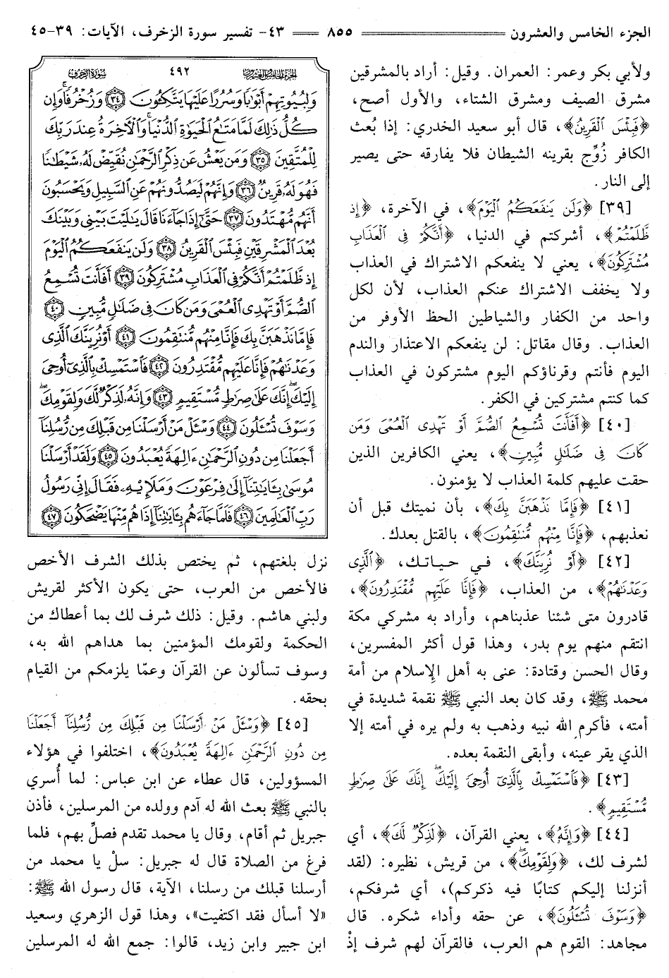 [45] {وَاسْأَلْ مَنْ أَرْسَلْنَا مِنْ قَبْلِكَ مِنْ رُسُلِنَا أَجَعَلْنَا مِنْ دُونِ الرَّحْمَنِ آلِهَةً يُعْبَدُونَ} [الزخرف: 45] اخْتَلَفُوا فِي هَؤُلَاءِ الْمَسْئُولِينَ، قَالَ عَطَاءٌ عَنِ ابْنِ عَبَّاسٍ: «لَمَّا أُسْرِيَ بِالنَّبِيِّ -صَلَّى اللَّهُ عَلَيْهِ وَسَلَّمَ- بَعَثَ اللَّهُ لَهُ آدَمَ وَوَلَدَهُ مِنَ الْمُرْسَلِينَ، فَأَذَّنَ جِبْرِيلُ ثُمَّ أَقَامَ، وَقَالَ يَا مُحَمَّدُ تَقَدَّمْ فَصَلِّ بِهِمْ، فَلَمَّا فَرَغَ مِنَ الصَّلَاةِ قَالَ لَهُ جِبْرِيلُ: سَلْ يَا مُحَمَّدُ مَنْ أَرْسَلْنَا قبلك من رسلنا، الْآيَةُ، قَالَ رَسُولُ اللَّهِ -صَلَّى اللَّهُ عَلَيْهِ وَسَلَّمَ-: " لَا أَسْأَلُ فَقَدِ اكْتَفَيْتُ» ، وَهَذَا قَوْلُ الزُّهْرِيِّ وَسَعِيدِ بْنِ جُبَيْرٍ وَابْنِ زَيْدٍ، قَالُوا: جَمَعَ اللَّهُ لَهُ الْمُرْسَلِينَ