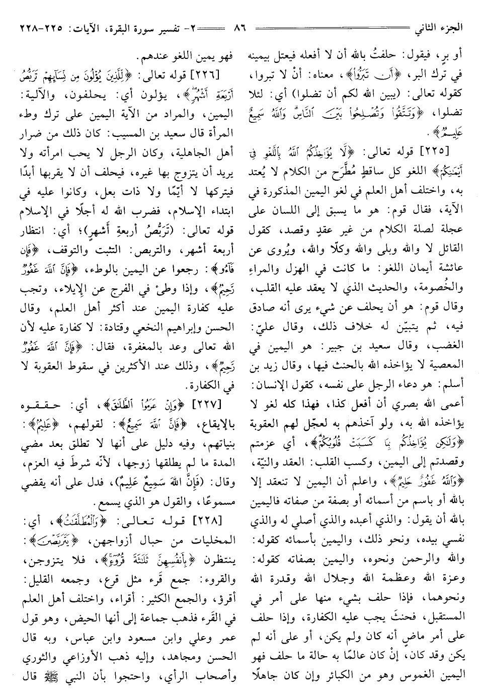 [225] قَوْلُهُ تَعَالَى: {لَا يُؤَاخِذُكُمُ اللَّهُ بِاللَّغْوِ فِي أَيْمَانِكُمْ} [البقرة: 225] اللغو كل ساقطٍ مُطَّرَح مِنَ الْكَلَامِ لَا يُعتد بِهِ، وَاخْتَلَفَ أَهْلُ الْعِلْمِ فِي لغو الْيَمِينِ الْمَذْكُورَةِ فِي الْآيَةِ، فَقَالَ قَوْمٌ: هُوَ مَا يَسْبِقُ إِلَى اللِّسَانِ عَلَى عَجَلَةٍ لِصِلَةِ الْكَلَامِ مِنْ غَيْرِ عقدٍ وَقَصْدٍ، كَقَوْلِ الْقَائِلِ لَا وَاللَّهِ وَبَلَى وَاللَّهِ وكلّا والله، ويُروى عَنْ عَائِشَةَ أَيْمَانُ اللَّغْوِ: مَا كَانَتْ فِي الْهَزْلِ والمراءِ والخُصومة، وَالْحَدِيثِ الَّذِي لَا يَعْقِدُ عَلَيْهِ الْقَلْبُ، وَقَالَ قَوْمٌ: هُوَ أَنْ يَحْلِفَ عَنْ شَيْءٍ يَرَى أَنَّهُ صَادِقٌ فِيهِ، ثُمَّ يَتَبَيَّنُ له خلاف ذلك، وقال عليّ: الغضب، وَقَالَ سَعِيدُ بْنُ جُبَيْرٍ: هُوَ الْيَمِينُ فِي الْمَعْصِيَةِ لَا يُؤَاخِذُهُ الله بالحنث فيها، وَقَالَ زَيْدُ بْنُ أَسْلَمَ: هُوَ دعاء الرجل على نفسه، كقول الإنسان: أعمى الله بصري أن أفعل كَذَا، فَهَذَا كُلُّهُ لَغْوٌ لَا يُؤَاخِذُهُ اللَّهُ بِهِ، وَلَوْ آخَذَهُمْ به لعجّل لهم العقوبة {وَلَكِنْ يُؤَاخِذُكُمْ بِمَا كَسَبَتْ قُلُوبُكُمْ} [البقرة: 225] أَيْ عَزَمْتُمْ وَقَصَدْتُمْ إِلَى الْيَمِينِ، وَكَسَبَ الْقَلْبُ: الْعَقْدَ وَالنِّيَّةَ، {وَاللَّهُ غَفُورٌ حَلِيمٌ} [البقرة: 225] وَاعْلَمْ أَنَّ الْيَمِينَ لَا تَنْعَقِدُ إِلَّا بِاللَّهِ أَوْ بِاسْمٍ مِنْ أَسْمَائِهِ أَوْ بِصِفَةٍ مِنْ صِفَاتِهِ فَالْيَمِينُ بِاللَّهِ أَنْ يَقُولَ: وَالَّذِي أَعْبُدُهُ وَالَّذِي أُصَلِّي لَهُ وَالَّذِي نَفْسِي بِيَدِهِ، وَنَحْوَ ذَلِكَ، وَالْيَمِينُ بِأَسْمَائِهِ كَقَوْلِهِ: وَاللَّهِ وَالرَّحْمَنِ وَنَحْوَهُ، وَالْيَمِينُ بِصِفَاتِهِ كَقَوْلِهِ: وَعِزَّةِ اللَّهِ وَعَظَمَةِ اللَّهِ وَجَلَالِ اللَّهِ وَقُدْرَةِ الله ونحوهما، فَإِذَا حَلَفَ بِشَيْءٍ مِنْهَا عَلَى أَمْرٍ فِي الْمُسْتَقْبَلِ، فحنثَ يَجِبُ عَلَيْهِ الْكَفَّارَةُ، وَإِذَا حَلَفَ عَلَى أَمْرٍ ماضٍ أَنَّهُ كَانَ وَلَمْ يَكُنْ، أَوْ عَلَى أَنَّهُ لَمْ يَكُنْ وَقَدْ كَانَ، إنْ كَانَ عَالِمًا بِهِ حَالَةَ مَا حَلَفَ فَهُوَ الْيَمِينُ الْغَمُوسُ وَهُوَ مِنَ الْكَبَائِرِ وَإِنْ كَانَ جَاهِلًا فَهُوَ يمين اللغو عندهم.