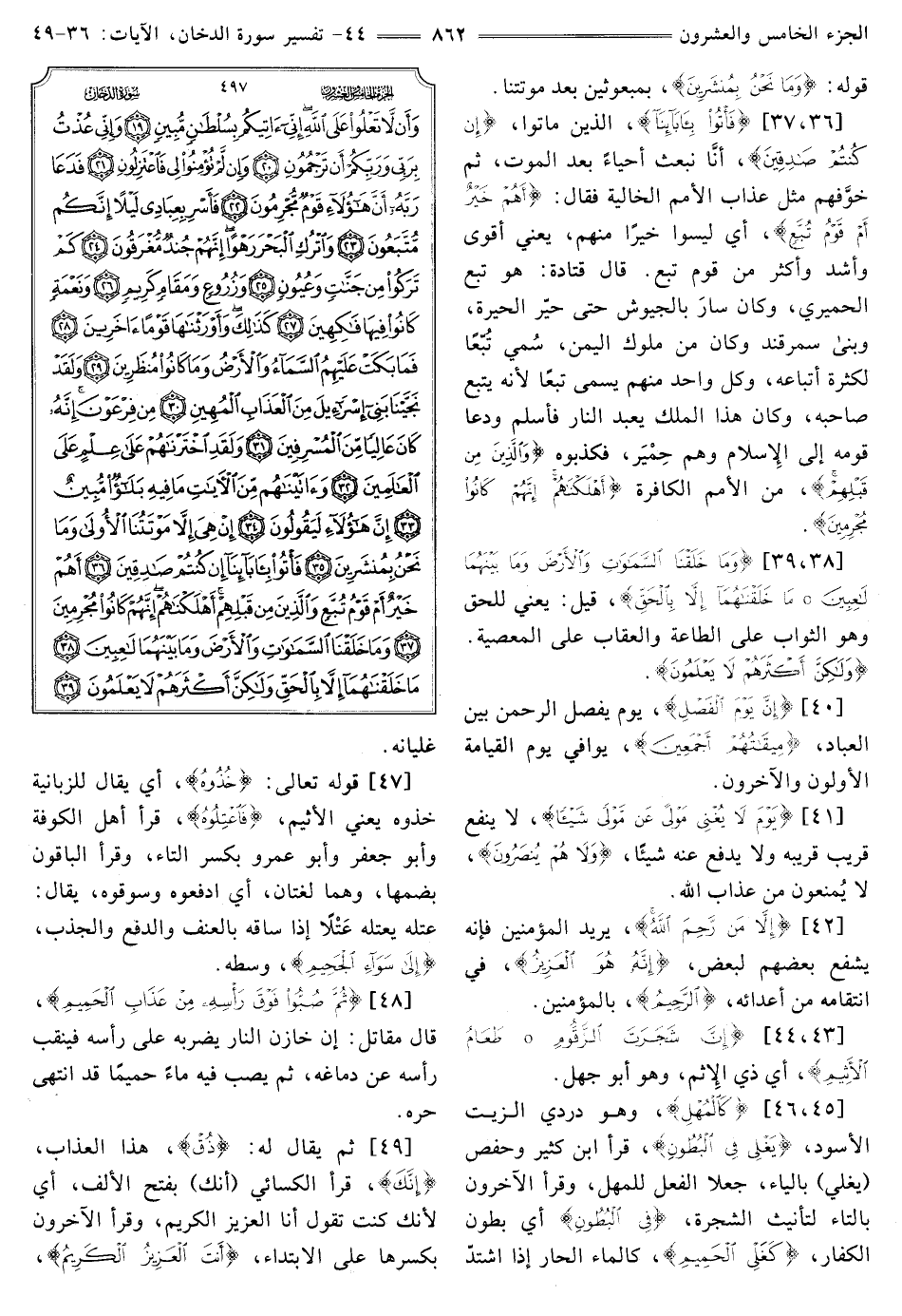 [49] ثم يقال له: {ذُقْ} [الدخان: 49] هذا العذاب، {إِنَّكَ} [الدخان: 49] قَرَأَ الْكِسَائِيُّ (أَنَّكَ) بِفَتْحِ الْأَلِفِ، أَيْ لِأَنَّكَ كُنْتَ تَقُولُ أَنَا العزيز الكريم، وَقَرَأَ الْآخَرُونَ بِكَسْرِهَا عَلَى الِابْتِدَاءِ، {أَنْتَ الْعَزِيزُ الْكَرِيمُ} [الدخان: 49]