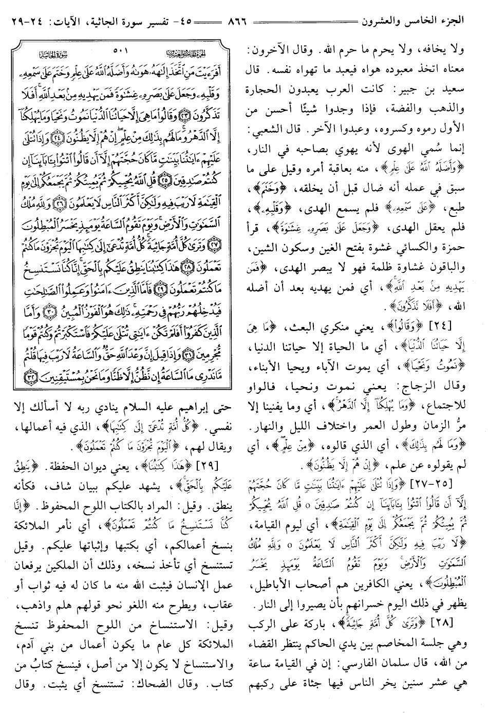 [28] {وَتَرَى كُلَّ أُمَّةٍ جَاثِيَةً} [الجاثية: 28] بَارِكَةً عَلَى الرُّكَبِ وَهِيَ جِلْسَةُ الْمُخَاصِمِ بَيْنَ يَدَيِ الْحَاكِمِ يَنْتَظِرُ القضاء من الله، قَالَ سَلْمَانُ الْفَارِسِيُّ: إِنَّ فِي الْقِيَامَةِ سَاعَةٌ هِيَ عَشْرُ سِنِينَ يَخِرُّ النَّاسُ فِيهَا جُثَاةً عَلَى رُكَبِهِمْ حَتَّى إِبْرَاهِيمَ عَلَيْهِ السَّلَامُ يُنَادِي رَبَّهُ لَا أَسْأَلُكَ إِلَّا نَفْسِي. {كُلُّ أُمَّةٍ تُدْعَى إِلَى كِتَابِهَا} [الجاثية: 28] الذي فيه أعمالها، وَيُقَالُ لَهُمُ، {الْيَوْمَ تُجْزَوْنَ مَا كُنْتُمْ تَعْمَلُونَ} [الجاثية: 28]