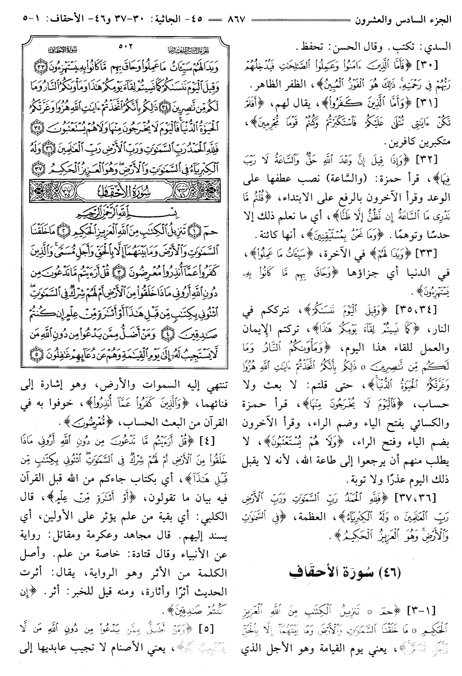 (46) سورة الأحقاف [1 - 3] {حم - تَنْزِيلُ الْكِتَابِ مِنَ اللَّهِ الْعَزِيزِ الْحَكِيمِ - مَا خَلَقْنَا السَّمَاوَاتِ وَالْأَرْضَ وَمَا بَيْنَهُمَا إِلَّا بِالْحَقِّ وَأَجَلٍ مُسَمًّى} [الأحقاف: 1 - 3] يَعْنِي يَوْمَ الْقِيَامَةِ وَهُوَ الْأَجَلُ الذي تنتهي إليه السماوات وَالْأَرْضُ، وَهُوَ إِشَارَةٌ إِلَى فَنَائِهِمَا، {وَالَّذِينَ كَفَرُوا عَمَّا أُنْذِرُوا} [الأحقاف: 3] خُوِّفُوا بِهِ فِي الْقُرْآنِ مِنَ البعث الحساب، {مُعْرِضُونَ} [الأحقاف: 3]