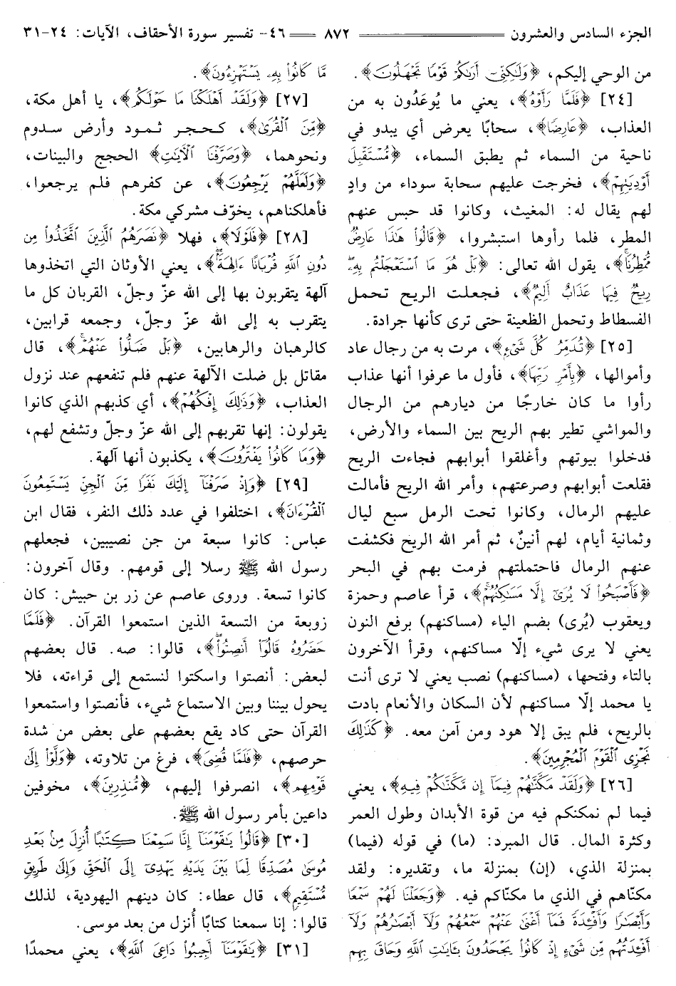 [26] {وَلَقَدْ مَكَّنَّاهُمْ فِيمَا إِنْ مَكَّنَّاكُمْ فِيهِ} [الأحقاف: 26] يَعْنِي فِيمَا لَمْ نُمَكِّنْكُمْ فِيهِ مِنْ قُوَّةِ الْأَبْدَانِ وَطُولِ الْعُمْرِ وَكَثْرَةِ الْمَالِ. قَالَ الْمُبَرِّدُ: (مَا) فِي قَوْلِهِ (فِيمَا) بِمَنْزِلَةِ الَّذِي، (إِنَّ) بِمَنْزِلَةِ مَا، وَتَقْدِيرُهُ: وَلَقَدْ مَكَّنَّاهُمْ فِي الَّذِي مَا مَكَّنَّاكُمْ فِيهِ. {وَجَعَلْنَا لَهُمْ سَمْعًا وَأَبْصَارًا وَأَفْئِدَةً فَمَا أَغْنَى عَنْهُمْ سَمْعُهُمْ وَلَا أَبْصَارُهُمْ وَلَا أَفْئِدَتُهُمْ مِنْ شَيْءٍ إِذْ كَانُوا يَجْحَدُونَ بِآيَاتِ اللَّهِ وَحَاقَ بِهِمْ مَا كَانُوا بِهِ يَسْتَهْزِئُونَ} [الأحقاف: 26]