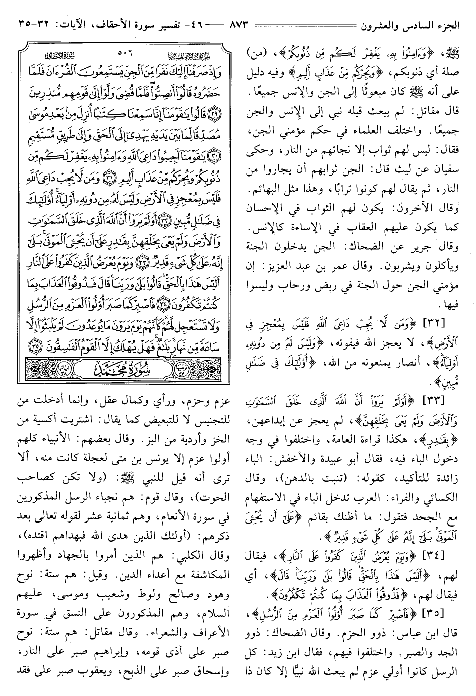 -صَلَّى اللَّهُ عَلَيْهِ وَسَلَّمَ- {وَآمِنُوا بِهِ يَغْفِرْ لَكُمْ مِنْ ذُنُوبِكُمْ} [الأحقاف: 31] (مِنْ) صِلَةٌ أَيْ ذُنُوبِكُمْ، {وَيُجِرْكُمْ مِنْ عَذَابٍ أَلِيمٍ} [الأحقاف: 31] وَفِيهِ دَلِيلٌ عَلَى أَنَّهُ -صَلَّى اللَّهُ عَلَيْهِ وَسَلَّمَ- كَانَ مَبْعُوثًا إِلَى الْجِنِّ وَالْإِنْسِ جَمِيعًا. قَالَ مُقَاتِلٌ: لَمْ يُبْعَثْ قَبْلَهُ نَبِيٌّ إِلَى الْإِنْسِ وَالْجِنِّ جَمِيعًا. وَاخْتَلَفَ الْعُلَمَاءُ فِي حُكْمِ مُؤْمِنِي الْجِنِّ، فقال: لَيْسَ لَهُمْ ثَوَابٌ إِلَّا نَجَاتُهُمْ من النار، وَحَكَى سُفْيَانُ عَنْ لَيْثٍ قَالَ: الْجِنُّ ثَوَابُهُمْ أَنْ يُجَارُوا مِنَ النَّارِ، ثُمَّ يُقَالُ لَهُمْ كُونُوا ترابا، وهذا مثل البهائم. وَقَالَ الْآخَرُونَ. يَكُونُ لَهُمُ الثَّوَابُ فِي الْإِحْسَانِ كَمَا يَكُونُ عَلَيْهِمُ العقاب في الإساءة كالإنس. وَقَالَ جَرِيرٌ عَنِ الضَّحَّاكِ: الْجِنُّ يدخلون الجنة ويأكلون ويشربون، وَقَالَ عُمَرُ بْنُ عَبْدِ الْعَزِيزِ: إِنَّ مُؤْمِنِي الْجِنِّ حَوْلَ الْجَنَّةِ فِي رَبَضٍ وَرِحَابٍ وَلَيْسُوا فِيهَا.