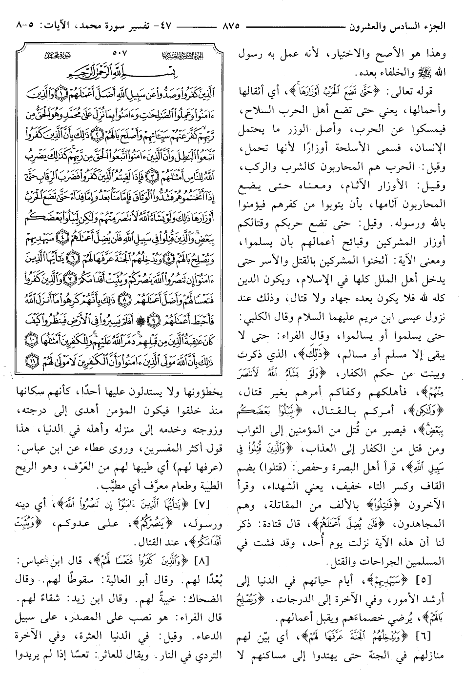 [5] {سَيَهْدِيهِمْ} [محمد: 5] أَيَّامَ حَيَاتِهِمْ فِي الدُّنْيَا إِلَى أَرْشَدِ الْأُمُورِ، وَفِي الْآخِرَةِ إِلَى الدرجات، {وَيُصْلِحُ بَالَهُمْ} [محمد: 5] يُرْضِي خصماءَهم وَيَقْبَلُ أَعْمَالَهُمْ.