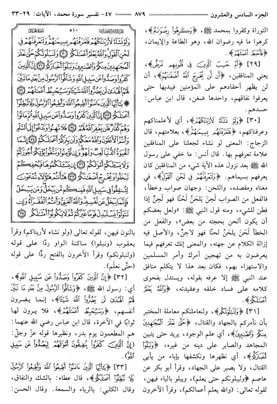 [32] {إِنَّ الَّذِينَ كَفَرُوا وَصَدُّوا عَنْ سَبِيلِ اللَّهِ} [محمد: 32] أي: رَسُولِ اللَّهِ -صَلَّى اللَّهُ عَلَيْهِ وسلم- {وَشَاقُّوا الرَّسُولَ مِنْ بَعْدِ مَا تَبَيَّنَ لَهُمُ الْهُدَى لَنْ يَضُرُّوا اللَّهَ شَيْئًا} [محمد: 32] إِنَّمَا يَضُرُّونَ أَنْفُسَهُمْ، {وَسَيُحْبِطُ أَعْمَالَهُمْ} [محمد: 32] فَلَا يَرَوْنَ لَهَا ثَوَابًا فِي الْآخِرَةِ، قَالَ ابْنُ عَبَّاسٍ -رَضِيَ الله عنهما-: هم المطعمون يوم بدر، ونظيرها قَوْلُهُ -عَزَّ وَجَلَّ-: {إِنَّ الَّذِينَ كَفَرُوا يُنْفِقُونَ أَمْوَالَهُمْ لِيَصُدُّوا عَنْ سَبِيلِ اللَّهِ} [الأنفال: 36]