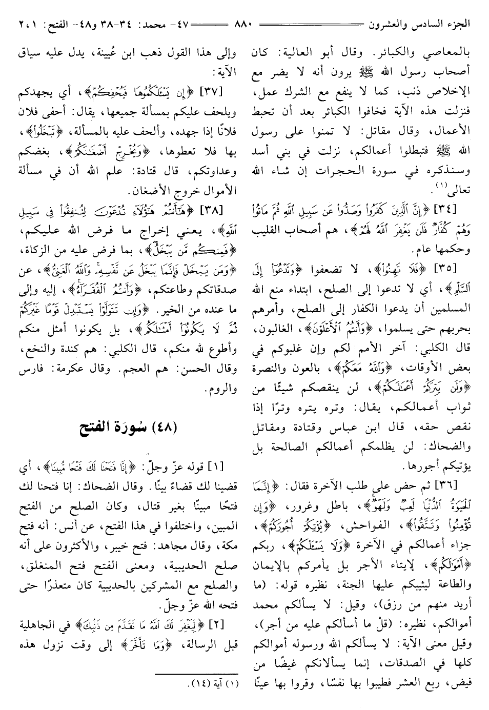 (48) سُورَةُ الفتح [1] قَوْلُهُ -عَزَّ وَجَلَّ-: {إِنَّا فَتَحْنَا لَكَ فَتْحًا مُبِينًا} [الفتح: 1] أَيْ قَضَيْنَا لَكَ قَضَاءً بَيِّنًا. وَقَالَ الضَّحَّاكُ: إِنَّا فَتَحْنَا لَكَ فَتْحًا مُبِينًا بِغَيْرِ قِتَالٍ، وَكَانَ الصلح من الفتح المبين، واختلفوا في هذا الفتح، عَنْ أَنَسٍ: أَنَّهُ فَتْحُ مَكَّةَ، وَقَالَ مُجَاهِدٌ: فَتْحُ خَيْبَرَ، وَالْأَكْثَرُونَ عَلَى أَنَّهُ صُلْحُ الْحُدَيْبِيَةِ، وَمَعْنَى الْفَتْحِ فَتْحُ الْمُنْغَلِقِ، وَالصُّلْحُ مَعَ الْمُشْرِكِينَ بِالْحُدَيْبِيَةِ كَانَ مُتَعَذِّرًا حَتَّى فتحه الله -عزّ وجلّ.