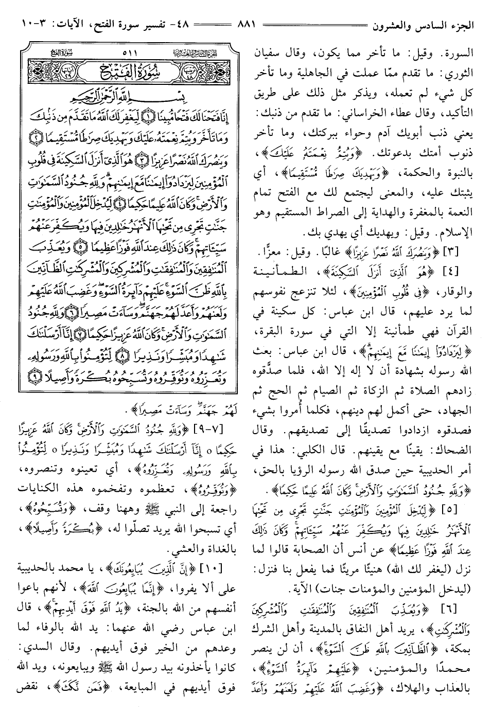 [7 - 9] {وَلِلَّهِ جُنُودُ السَّمَاوَاتِ وَالْأَرْضِ وَكَانَ اللَّهُ عَزِيزًا حَكِيمًا - إِنَّا أَرْسَلْنَاكَ شَاهِدًا وَمُبَشِّرًا وَنَذِيرًا - لِتُؤْمِنُوا بِاللَّهِ وَرَسُولِهِ وَتُعَزِّرُوهُ} [الفتح: 7 - 9] أي تعينوه وتنصروه، {وَتُوَقِّرُوهُ} [الفتح: 9] تُعَظِّمُوهُ وَتُفَخِّمُوهُ هَذِهِ الْكِنَايَاتُ رَاجِعَةٌ إِلَى النَّبِيِّ -صَلَّى اللَّهُ عَلَيْهِ وسلم- وهاهنا وقف، {وَتُسَبِّحُوهُ} [الفتح: 9] أَيْ تُسَبِّحُوا اللَّهَ يُرِيدُ تُصَلُّوا له، {بُكْرَةً وَأَصِيلًا} [الفتح: 9] بالغداة والعشي.