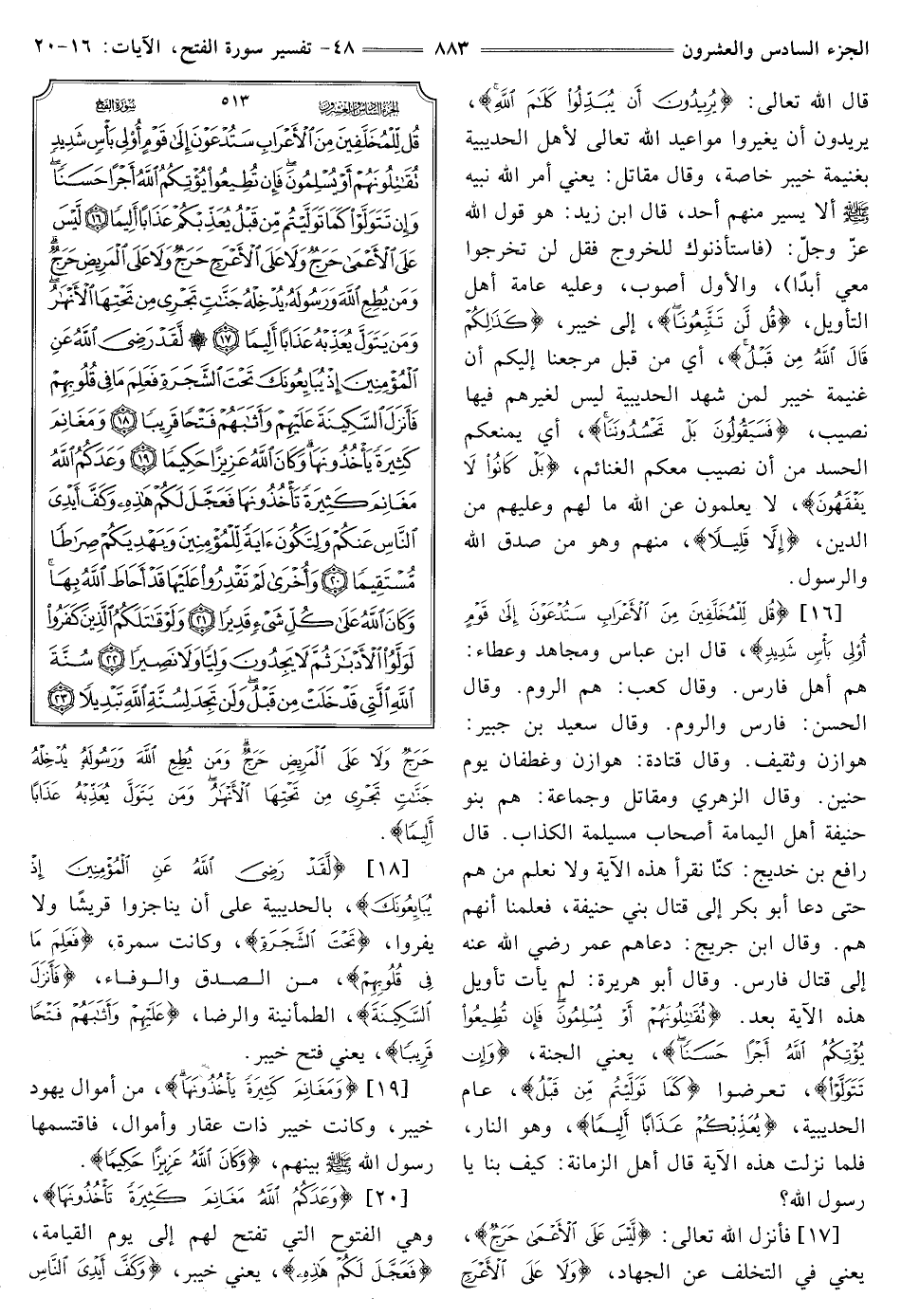 [16] {قُلْ لِلْمُخَلَّفِينَ مِنَ الْأَعْرَابِ سَتُدْعَوْنَ إِلَى قَوْمٍ أُولِي بَأْسٍ شَدِيدٍ} [الفتح: 16] قَالَ ابْنُ عَبَّاسٍ وَمُجَاهِدٌ وَعَطَاءٌ: هُمْ أَهْلُ فَارِسَ. وَقَالَ كَعْبٌ: هُمُ الرُّومُ. وَقَالَ الْحَسَنُ: فَارِسُ وَالرُّومُ. وَقَالَ سَعِيدُ بْنُ جُبَيْرٍ: هَوَازِنُ وَثَقِيفٌ. وَقَالَ قَتَادَةُ: هَوَازِنُ وَغَطَفَانُ يَوْمَ حُنَيْنٍ. وَقَالَ الزُّهْرِيُّ وَمُقَاتِلٌ وَجَمَاعَةٌ: هُمْ بَنُو حَنِيفَةَ أَهْلُ الْيَمَامَةِ أَصْحَابُ مُسَيْلِمَةَ الْكَذَّابِ. قال زافر بْنُ خَدِيجٍ: كُنَّا نَقْرَأُ هَذِهِ الْآيَةِ وَلَا نَعْلَمُ مَنْ هُمْ حَتَّى دَعَا أَبُو بَكْرٍ إِلَى قِتَالِ بَنِي حَنِيفَةَ، فَعَلِمْنَا أَنَّهُمْ هم. وقال ابن جريش دَعَاهُمْ عُمَرُ -رَضِيَ اللَّهُ عَنْهُ- إِلَى قِتَالِ فَارِسَ. وَقَالَ أَبُو هريرة: لم يأت تأويل هَذِهِ الْآيَةُ بَعْدُ. {تُقَاتِلُونَهُمْ أَوْ يُسْلِمُونَ فَإِنْ تُطِيعُوا يُؤْتِكُمُ اللَّهُ أَجْرًا حَسَنًا} [الفتح: 16] يعني الجنة، {وَإِنْ تَتَوَلَّوْا} [الفتح: 16] تُعْرِضُوا {كَمَا تَوَلَّيْتُمْ مِنْ قَبْلُ} [الفتح: 16] عَامَ الْحُدَيْبِيَةِ، {يُعَذِّبْكُمْ عَذَابًا أَلِيمًا} [الفتح: 16] وَهُوَ النَّارُ، فَلَمَّا نَزَلَتْ هَذِهِ الْآيَةُ قَالَ أَهْلُ الزَّمَانَةِ: كَيْفَ بنا يَا رَسُولَ اللَّهِ؟
