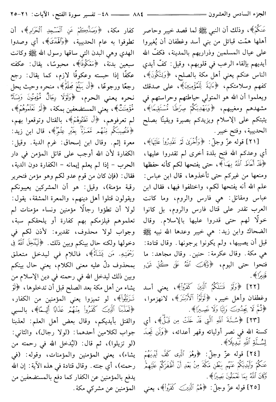 [25] قَوْلُهُ -عَزَّ وَجَلَّ: {هُمُ الَّذِينَ كَفَرُوا} [الفتح: 25] يَعْنِي كُفَّارَ مَكَّةَ، {وَصَدُّوكُمْ عَنِ الْمَسْجِدِ الْحَرَامِ} [الفتح: 25] أن تطوفوا به عام الحديبية، {وَالْهَدْيَ} [الفتح: 25] أَيْ وَصَدُّوا الْهَدْيَ وَهِيَ الْبُدْنُ الَّتِي سَاقَهَا رَسُولُ اللَّهِ -صَلَّى اللَّهُ عَلَيْهِ وَسَلَّمَ- وَكَانَتْ سَبْعِينَ بدنة، {مَعْكُوفًا} [الفتح: 25] مَحْبُوسًا، يُقَالُ: عَكَفْتُهُ عَكْفًا إِذَا حَبَسْتُهُ وَعُكُوفًا لَازِمٌ، كَمَا يُقَالُ: رَجَعَ رَجْعًا وَرُجُوعًا، {أَنْ يَبْلُغَ مَحِلَّهُ} [الفتح: 25] مَنْحَرَهُ وَحَيْثُ يَحُلُّ نَحْرُهُ يَعْنِي الْحَرَمَ، {وَلَوْلَا رِجَالٌ مُؤْمِنُونَ وَنِسَاءٌ مُؤْمِنَاتٌ} [الفتح: 25] يَعْنِي الْمُسْتَضْعَفِينَ بِمَكَّةَ، {لَمْ تَعْلَمُوهُمْ} [الفتح: 25] لم تعرفوهم، {أَنْ تَطَئُوهُمْ} [الفتح: 25] بالقتال وَتُوقِعُوا بِهِمْ، {فَتُصِيبَكُمْ مِنْهُمْ مَعَرَّةٌ بِغَيْرِ عِلْمٍ} [الفتح: 25] قَالَ ابْنُ زَيْدٍ: مَعَرَّةٌ إِثْمٌ. وَقَالَ ابْنُ إِسْحَاقَ: غُرْمُ الدِّيَةِ. وقيل: الكفارة لأن الله أَوْجَبَ عَلَى قَاتِلِ الْمُؤْمِنِ فِي دَارِ الْحَرْبِ - إِذَا لَمْ يُعْلَمُ إِيمَانُهُ - الْكَفَّارَةَ دُونَ الدِّيَةِ، فَقَالَ: {فَإِنْ كَانَ مِنْ قَوْمٍ عَدُوٍّ لَكُمْ وَهُوَ مُؤْمِنٌ فَتَحْرِيرُ رَقَبَةٍ مُؤْمِنَةٍ} [النِّسَاءِ: 92] وَقِيلَ: هُوَ أَنَّ الْمُشْرِكِينَ يَعِيبُونَكُمْ وَيَقُولُونَ قَتَلُوا أَهْلَ دِينَهُمْ، وَالْمَعَرَّةُ الْمَشَقَّةُ، يَقُولُ: لَوْلَا أَنْ تَطَئُوا رِجَالًا مُؤْمِنِينَ وَنِسَاءً مُؤْمِنَاتٍ لَمْ تَعْلَمُوهُمْ فَيَلْزَمُكُمْ بِهِمْ كَفَّارَةٌ أَوْ يَلْحَقُكُمْ سُبَّةٌ، وَجَوَابُ لَوْلَا مَحْذُوفٌ، تَقْدِيرُهُ: لَأُذِنَ لَكُمْ فِي دُخُولِهَا وَلَكِنَّهُ حَالَ بَيْنَكُمْ وَبَيْنَ ذَلِكَ. {لِيُدْخِلَ اللَّهُ فِي رَحْمَتِهِ مَنْ يَشَاءُ} [الفتح: 25] فَاللَّامُ فِي لِيُدْخِلَ مُتَعَلِّقٌ بِمَحْذُوفٍ دَلَّ عَلَيْهِ مَعْنَى الْكَلَامِ، يَعْنِي حَالَ بَيْنَكُمْ وَبَيْنَ ذَلِكَ لِيُدْخِلَ اللَّهُ فِي رَحْمَتِهِ فِي دِينِ الْإِسْلَامِ مَنْ يَشَاءُ مِنْ أَهْلِ مَكَّةَ بَعْدَ الصُّلْحِ قَبْلَ أَنْ تدخلوها، {لَوْ تَزَيَّلُوا} [الفتح: 25] لَوْ تَمَيَّزُوا يَعْنِي الْمُؤْمِنِينَ مِنَ الْكُفَّارِ، {لَعَذَّبْنَا الَّذِينَ كَفَرُوا مِنْهُمْ عَذَابًا أَلِيمًا} [الفتح: 25] بِالسَّبْيِ وَالْقَتْلِ بِأَيْدِيكُمْ، وَقَالَ بَعْضُ أَهْلِ الْعِلْمِ: لَعَذَّبْنَا جَوَابٌ لِكَلَامَيْنِ أَحَدِهِمَا: (لَوْلَا رِجَالٌ) ، وَالثَّانِي: (لَوْ تَزَيَّلُوا) ، ثُمَّ قَالَ: {لِيُدْخِلَ اللَّهُ فِي رَحْمَتِهِ مَنْ يَشَاءُ} [الفتح: 25] يعني المؤمنين والمؤمنات، وقوله: (في رحمته) ، أي جنته. وَقَالَ قَتَادَةُ فِي هَذِهِ الْآيَةِ: إن الله يدفع بالمؤمن عن الكفار كما دفع بالمستضعفين من المؤمنين عن مشركي مكة.