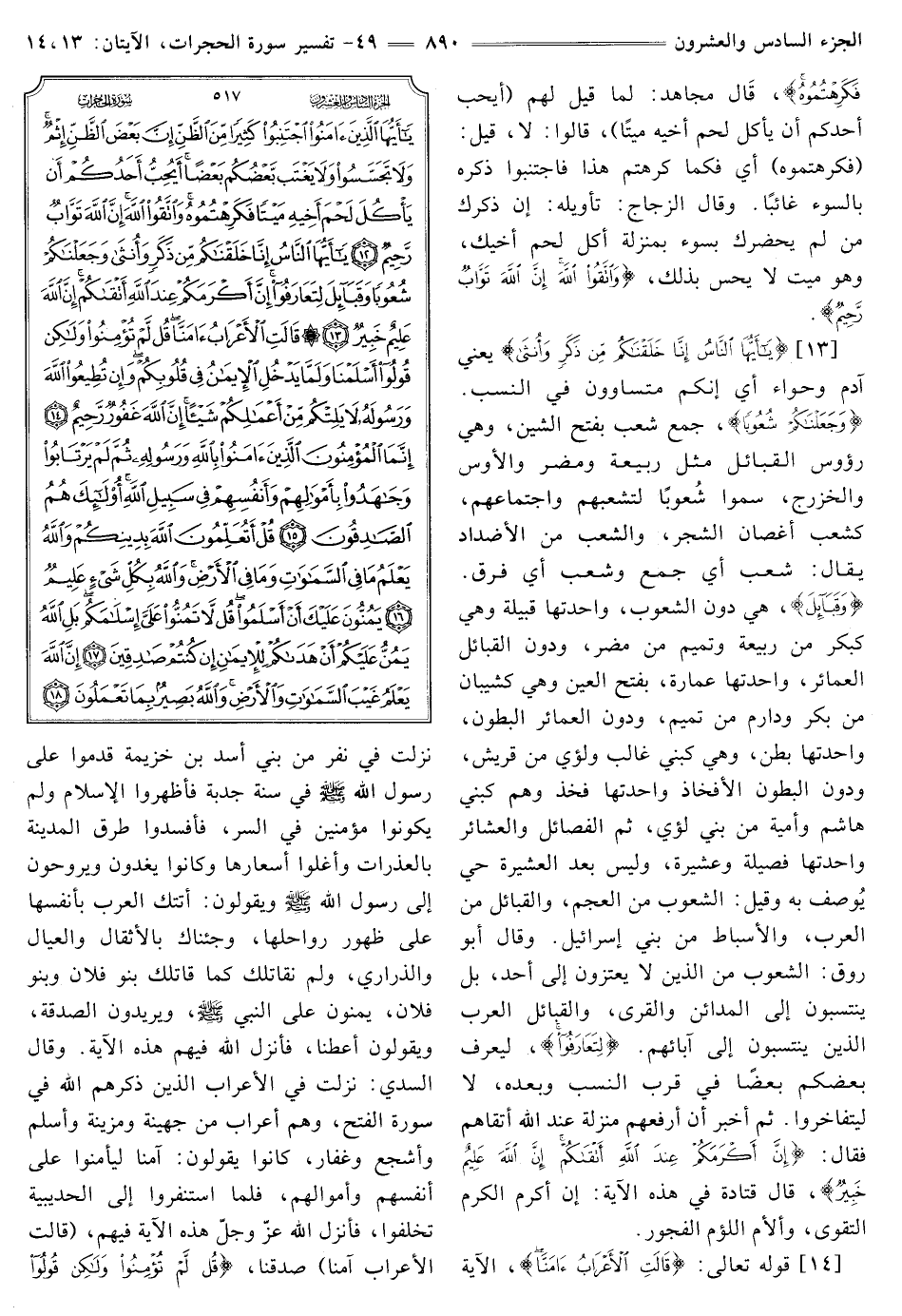 [13] {يَا أَيُّهَا النَّاسُ إِنَّا خَلَقْنَاكُمْ مِنْ ذَكَرٍ وَأُنْثَى} [الحجرات: 13] يَعْنِي آدَمَ وَحَوَّاءَ أَيْ إِنَّكُمْ مُتَسَاوُونَ فِي النَّسَبِ. {وَجَعَلْنَاكُمْ شُعُوبًا} [الحجرات: 13] جَمْعُ شَعْبٍ بِفَتْحِ الشِّينِ، وَهِيَ رُءُوسُ الْقَبَائِلِ مِثْلُ رَبِيعَةَ وَمُضَرَ وَالْأَوْسِ وَالْخَزْرَجِ، سُمُّوا شُعُوبًا لِتَشَعُّبِهِمْ وَاجْتِمَاعِهِمْ، كَشُعَبِ أَغْصَانِ الشَّجَرِ، وَالشَّعْبُ مِنَ الْأَضْدَادِ يُقَالُ: شَعَبَ أَيْ جَمَعَ وَشَعَبَ أَيْ فَرَّقَ.