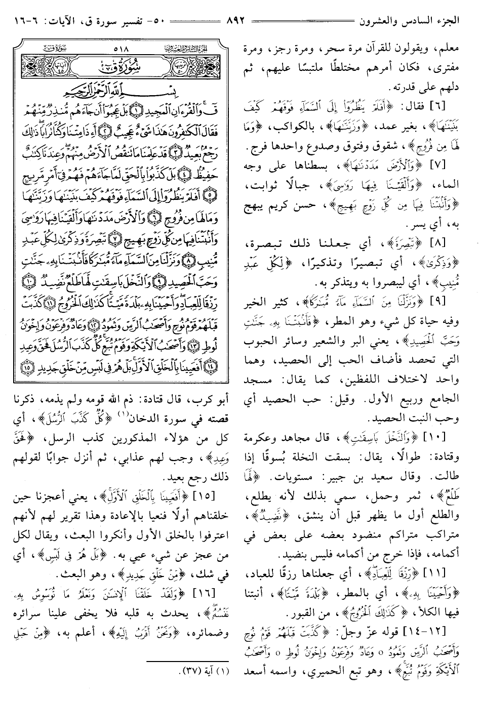 [9] {وَنَزَّلْنَا مِنَ السَّمَاءِ مَاءً مُبَارَكًا} [ق: 9] كَثِيرَ الْخَيْرِ وَفِيهِ حَيَاةُ كُلِّ شَيْءٍ وَهُوَ الْمَطَرُ، {فَأَنْبَتْنَا بِهِ جَنَّاتٍ وَحَبَّ الْحَصِيدِ} [ق: 9] يَعْنِي الْبُرَّ وَالشَّعِيرَ وَسَائِرَ الْحُبُوبِ الَّتِي تَحْصُدُ فَأَضَافَ الْحَبَّ إِلَى الْحَصِيدِ، وَهُمَا وَاحِدٌ لِاخْتِلَافِ اللَّفْظَيْنِ، كَمَا يُقَالُ: مَسْجِدُ الْجَامِعِ وَرَبِيعُ الأول. وقيل: حب الْحَصِيدِ أَيْ وَحَبُّ النَّبْتِ الْحَصِيدِ.