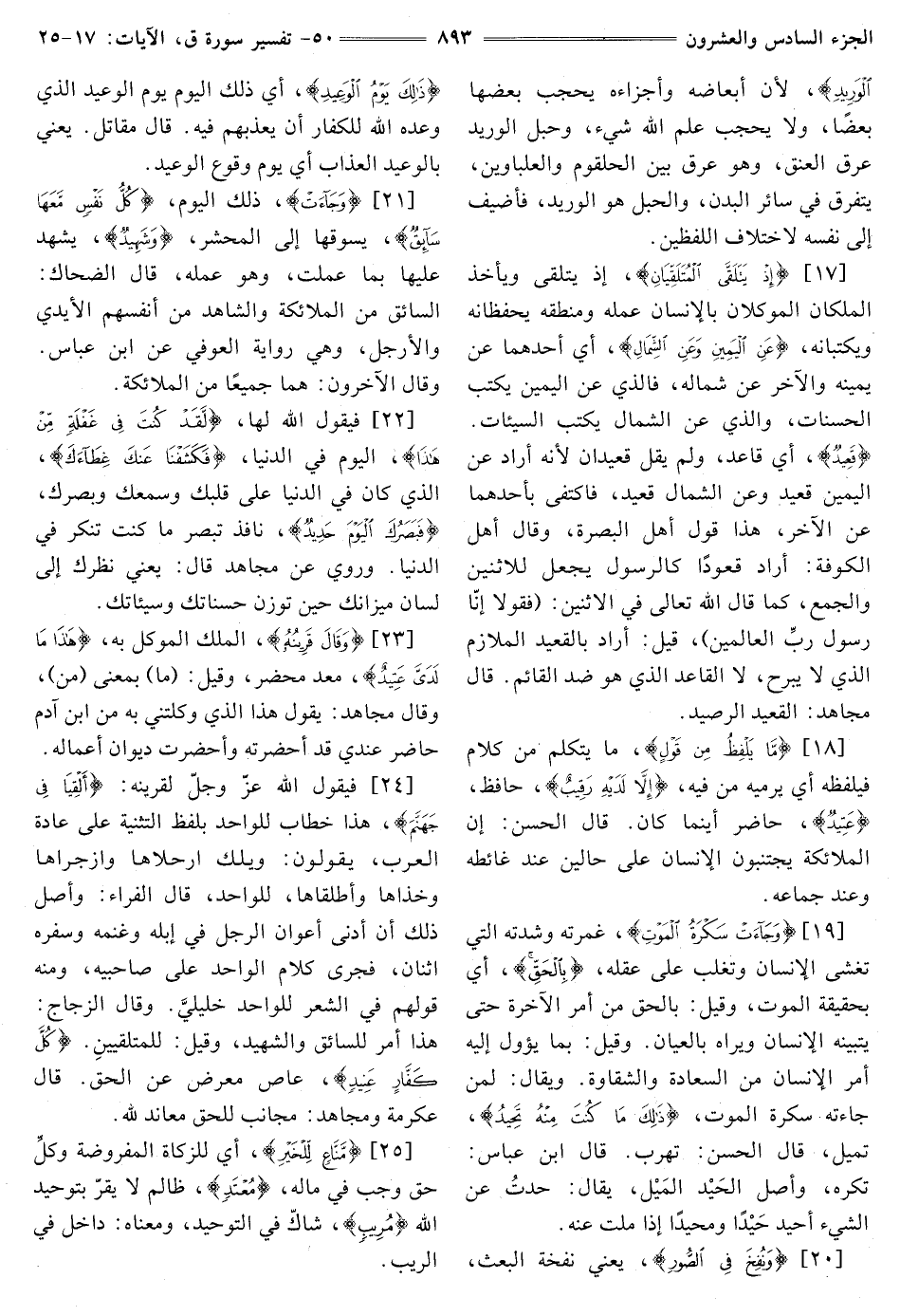 [17] {إِذْ يَتَلَقَّى الْمُتَلَقِّيَانِ} [ق: 17] إذ يَتَلَقَّى وَيَأْخُذُ الْمَلَكَانِ الْمُوَكَّلَانِ بِالْإِنْسَانِ عَمَلَهُ وَمَنْطِقَهُ يَحْفَظَانِهِ وَيَكْتُبَانِهِ، {عَنِ الْيَمِينِ وَعَنِ الشِّمَالِ} [ق: 17] أَيْ أَحَدُهُمَا عَنْ يَمِينِهِ وَالْآخَرُ عَنْ شِمَالِهِ، فَالَّذِي عَنِ الْيَمِينِ يَكْتُبُ الْحَسَنَاتِ، وَالَّذِي عَنِ الشِّمَالِ يكتب السيئات. {قَعِيدٌ} [ق: 17] أَيْ قَاعِدٌ، وَلَمْ يَقُلْ قَعِيدَانِ لِأَنَّهُ أَرَادَ عَنِ الْيَمِينِ قَعِيدٌ وَعَنِ الشِّمَالِ قَعِيدٌ، فَاكْتَفَى بِأَحَدِهِمَا عَنِ الْآخَرِ، هَذَا قَوْلُ أَهْلِ الْبَصْرَةِ، وَقَالَ أَهْلُ الْكُوفَةِ: أَرَادَ قعودا كالرسول يجعل لِلِاثْنَيْنِ وَالْجَمْعِ، كَمَا قَالَ اللَّهُ تَعَالَى فِي الِاثْنَيْنِ: {فَقُولَا إِنَّا رَسُولُ رَبِّ الْعَالَمِينَ} [الشعراء: 16] قيل: أَرَادَ بِالْقَعِيدِ الْمُلَازِمَ الَّذِي لَا يَبْرَحُ، لَا الْقَاعِدَ الَّذِي هُوَ ضد القائم. قال مُجَاهِدٌ: الْقَعِيدُ الرَّصِيدُ.