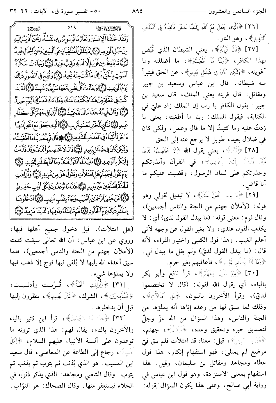 [30] {يَوْمَ نَقُولُ لِجَهَنَّمَ} [ق: 30] قرأ نافع وأبو بكر بِالْيَاءِ، أَيْ يَقُولُ اللَّهُ لِقَوْلِهِ: (قَالَ لَا تَخْتَصِمُوا لَدَيَّ) ، وَقَرَأَ الْآخَرُونَ بِالنُّونِ، {هَلِ امْتَلَأْتِ} [ق: 30] وَذَلِكَ لِمَا سَبَقَ لَهَا مِنْ وَعْدِهِ إِيَّاهَا أَنَّهُ يَمْلَؤُهَا مِنَ الْجِنَّةِ وَالنَّاسِ، وَهَذَا السُّؤَالُ مِنَ اللَّهِ -عَزَّ وَجَلَّ- لِتَصْدِيقِ خَبَرِهِ وتحقيق وعده، {وَتَقُولُ} [ق: 30] جهنم، {هَلْ مِنْ مَزِيدٍ} [ق: 30] قيل: معناه قد امتلأت فلم يَبْقَ فِيَّ مَوْضِعٌ لَمْ يَمْتَلِئْ، فَهُوَ اسْتِفْهَامُ إِنْكَارٍ، هَذَا قَوْلُ عَطَاءٍ وَمُجَاهِدٍ وَمُقَاتِلِ بْنِ سُلَيْمَانَ، وَقِيلَ: هَذَا اسْتِفْهَامٌ بِمَعْنَى الِاسْتِزَادَةِ، وَهُوَ قَوْلُ ابْنِ عَبَّاسٍ فِي رِوَايَةِ أَبِي صَالِحٍ وَعَلَى هَذَا يَكُونُ السُّؤَالُ بِقَوْلِهِ:
