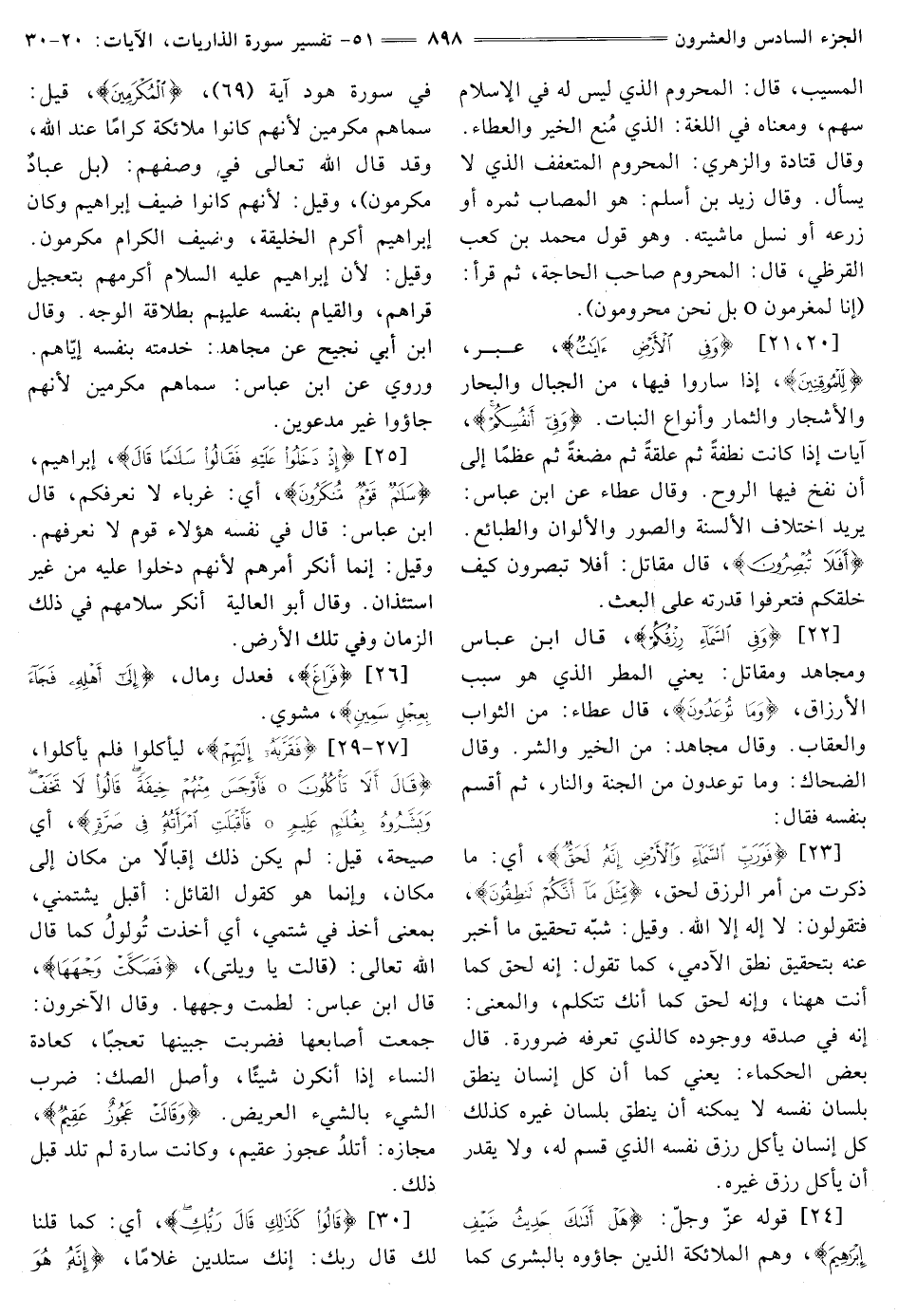 [24] قَوْلُهُ عَزَّ وَجَلَّ: {هَلْ أَتَاكَ حَدِيثُ ضَيْفِ إِبْرَاهِيمَ} [الذاريات: 24] وهم الملائكة الذين جاءوه بالبشرى كما في سورة هود آية (69) ، {الْمُكْرَمِينَ} [الذاريات: 24] قِيلَ: سَمَّاهُمْ مُكْرَمِينَ لِأَنَّهُمْ كَانُوا مَلَائِكَةً كِرَامًا عِنْدَ اللَّهِ، وَقَدْ قَالَ اللَّهُ تَعَالَى فِي وَصْفِهِمْ.