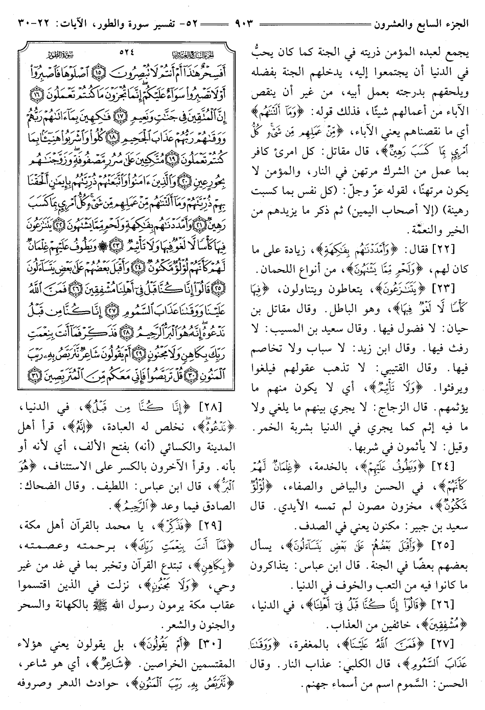 [29] {فَذَكِّرْ} [الطور: 29] يَا مُحَمَّدُ بِالْقُرْآنِ أَهْلَ مَكَّةَ {فَمَا أَنْتَ بِنِعْمَتِ رَبِّكَ} [الطور: 29] برحمته وعصمته، {بِكَاهِنٍ} [الطور: 29] تبتدع القرآن وَتُخْبِرُ بِمَا فِي غَدٍ مِنْ غير وحي، {وَلَا مَجْنُونٍ} [الطور: 29] نَزَلَتْ فِي الَّذِينَ اقْتَسَمُوا عِقَابَ مَكَّةَ يَرْمُونَ رَسُولَ اللَّهِ صَلَّى اللَّهُ عَلَيْهِ وَسَلَّمَ بِالْكِهَانَةِ وَالسِّحْرِ والجنون والشعر.