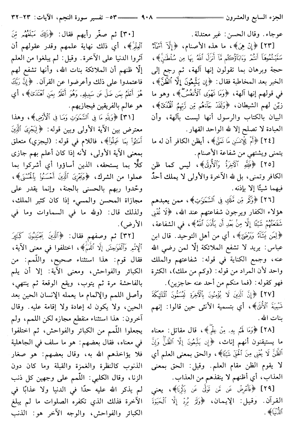 [31] {وَلِلَّهِ مَا فِي السَّمَاوَاتِ وَمَا فِي الْأَرْضِ} [النجم: 31] وَهَذَا مُعْتَرِضٌ بَيْنَ الْآيَةِ الْأُولَى وَبَيْنَ قَوْلِهِ: {لِيَجْزِيَ الَّذِينَ أَسَاءُوا بِمَا عَمِلُوا} [النجم: 31] فَاللَّامُ فِي قَوْلِهِ: (لِيَجْزِيَ) مُتَعَلِّقٌ بِمَعْنَى الْآيَةِ الْأُولَى، لِأَنَّهُ إِذَا كَانَ أَعْلَمَ بِهِمْ جَازَى كُلًّا بما يستحقه، الذين أساءوا أي أشركوا بِمَا عَمِلُوا مِنَ الشِّرْكِ، {وَيَجْزِيَ الَّذِينَ أَحْسَنُوا بِالْحُسْنَى} [النجم: 31] وَحَّدُوا رَبَّهُمْ بِالْحُسْنَى بِالْجَنَّةِ، وَإِنَّمَا يُقَدَّرُ عَلَى مُجَازَاةِ الْمُحْسِنِ وَالْمُسِيءِ إِذَا كَانَ كَثِيرَ الْمُلْكِ، وَلِذَلِكَ قَالَ: {وَلِلَّهِ مَا فِي السَّمَاوَاتِ وَمَا فِي الْأَرْضِ} [النجم: 31]
