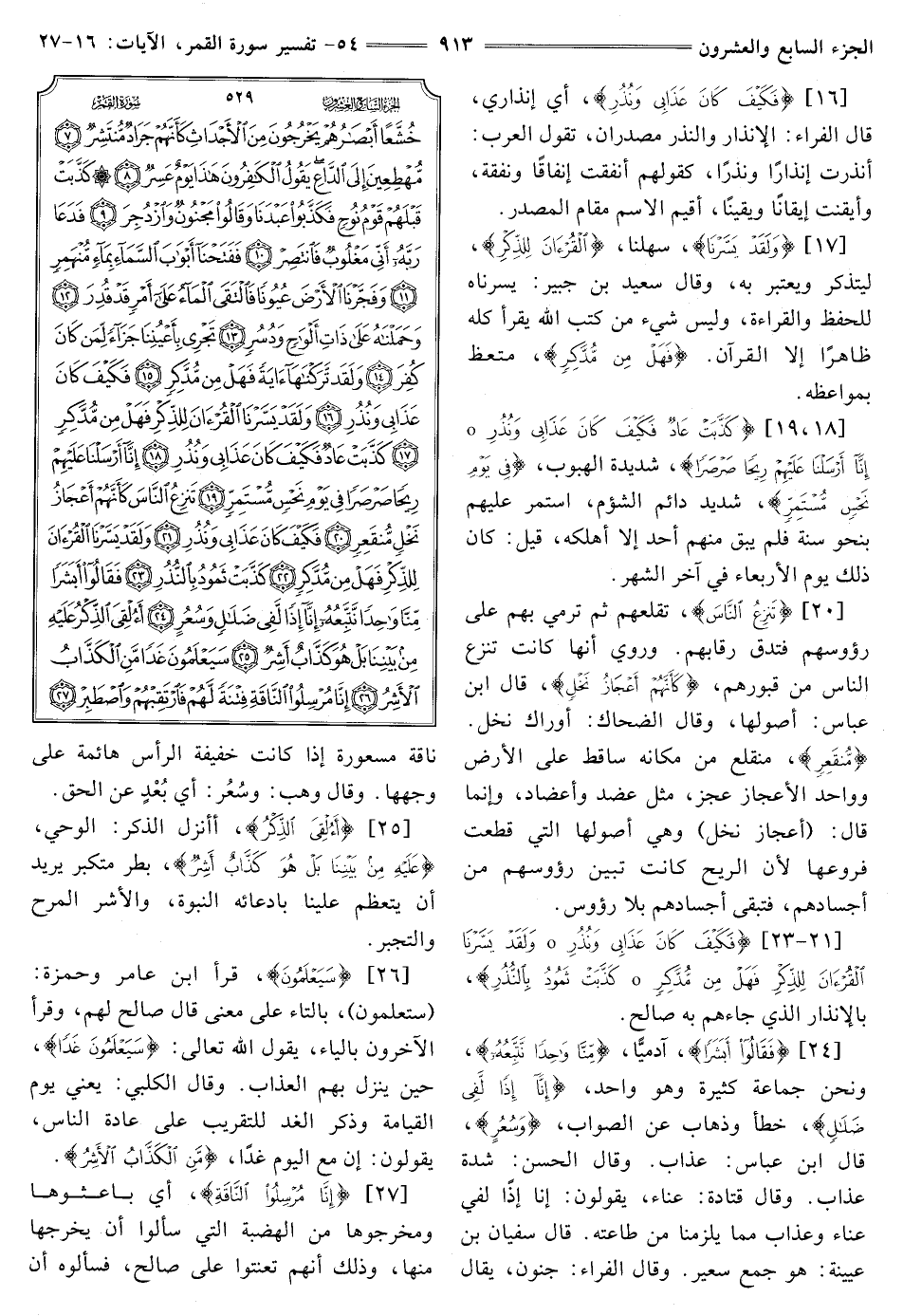 [19] {كَذَّبَتْ عَادٌ فَكَيْفَ كَانَ عَذَابِي وَنُذُرِ - إِنَّا أَرْسَلْنَا عَلَيْهِمْ رِيحًا صَرْصَرًا} [القمر: 18 - 19] شَدِيدَةَ الْهُبُوبِ، {فِي يَوْمِ نَحْسٍ مُسْتَمِرٍّ} [القمر: 19] شَدِيدٍ دَائِمِ الشُّؤْمِ، اسْتَمَرَّ عَلَيْهِمْ بِنَحْوِ سَنَةٍ فَلَمْ يُبْقِ مِنْهُمْ أحد إِلَّا أَهْلَكَهُ، قِيلَ: كَانَ ذَلِكَ يَوْمُ الْأَرْبِعَاءِ فِي آخِرِ الشَّهْرِ.
