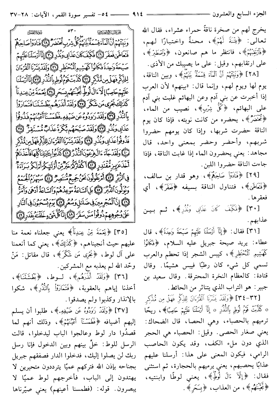 [29] {فَنَادَوْا صَاحِبَهُمْ} [القمر: 29] وَهُوَ قِدَارُ بْنُ سَالِفٍ، {فَتَعَاطَى} [القمر: 29] فتناول الناقة بسيفه {فَعَقَرَ} [القمر: 29] أَيْ فَعَقَرَهَا.