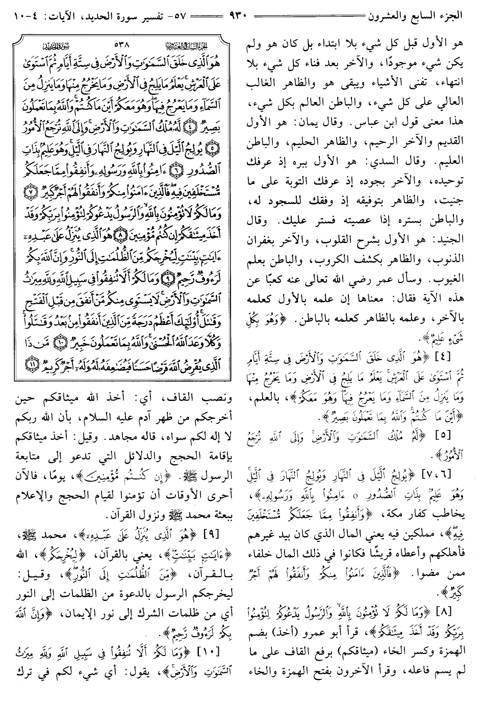 هُوَ الْأَوَّلُ قَبْلَ كُلِّ شَيْءٍ بلا ابتداء بل كَانَ هُوَ وَلَمْ يَكُنْ شَيْءٌ موجودا، والآخر بَعْدَ فَنَاءِ كُلِّ شَيْءٍ بِلَا انْتِهَاءٍ، تَفْنَى الْأَشْيَاءُ وَيَبْقَى هُوَ والظاهر الْغَالِبُ الْعَالِي عَلَى كُلِّ شَيْءٍ، والباطن الْعَالِمُ بِكُلِّ شَيْءٍ، هَذَا مَعْنَى قَوْلِ ابْنِ عَبَّاسٍ.
