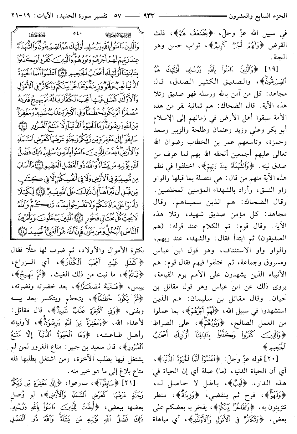 [19] {وَالَّذِينَ آمَنُوا بِاللَّهِ وَرُسُلِهِ أُولَئِكَ هُمُ الصِّدِّيقُونَ} [الحديد: 19] وَالصِّدِّيقُ الْكَثِيرُ الصِّدْقَ، قَالَ مُجَاهِدٌ: كل من آمن بالله ورسله فَهُوَ صِدِّيقٌ وَتَلَا هَذِهِ الْآيَةَ.