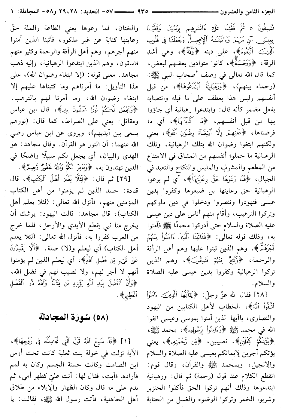 [28] فَقَالَ اللَّهُ عَزَّ وَجَلَّ: {يَا أَيُّهَا الَّذِينَ آمَنُوا اتَّقُوا اللَّهَ} [الحديد: 28] الْخِطَابُ لِأَهْلِ الْكِتَابَيْنِ مِنَ الْيَهُودِ والنصارى، يَا أَيُّهَا الَّذِينَ آمَنُوا بِمُوسَى وَعِيسَى اتَّقَوْا اللَّهَ فِي مُحَمَّدٍ صَلَّى اللَّهُ عَلَيْهِ وَسَلَّمَ {وَآمِنُوا بِرَسُولِهِ} [الحديد: 28] مُحَمَّدٍ صَلَّى اللَّهُ عَلَيْهِ وَسَلَّمَ، {يُؤْتِكُمْ كِفْلَيْنِ} [الحديد: 28] نصيبين، {مِنْ رَحْمَتِهِ} [الحديد: 28] يَعْنِي يُؤْتِكُمْ أَجْرَيْنِ لِإِيمَانِكُمْ بِعِيسَى عَلَيْهِ الصَّلَاةُ وَالسَّلَامُ وَالْإِنْجِيلِ، وَبِمُحَمَّدٍ صَلَّى اللَّهُ عَلَيْهِ وَسَلَّمَ وَالْقُرْآنِ، وَقَالَ قَوْمٌ: انْقَطَعَ الْكَلَامُ عِنْدَ قوله (رحمة) ثم قال: وَرَهْبَانِيَّةٌ ابْتَدَعُوهَا وَذَلِكَ أَنَّهُمْ تَرَكُوا الْحَقَّ فَأَكَلُوا الْخِنْزِيرَ وَشَرِبُوا الْخَمْرَ وَتَرَكُوا الْوُضُوءَ وَالْغُسْلَ مِنَ الْجَنَابَةِ وَالْخِتَانَ، فَمَا رَعَوْهَا يَعْنِي الطَّاعَةَ وَالْمِلَّةَ حَقَ رِعَايَتِهَا كِنَايَةً عَنْ غَيْرِ مَذْكُورٍ، فَآتَيْنَا الَّذِينَ آمَنُوا مِنْهُمْ أَجْرَهُمْ، وَهُمْ أَهْلُ الرَّأْفَةِ وَالرَّحْمَةِ وَكَثِيرٌ مِنْهُمْ فَاسِقُونَ، وَهُمُ الَّذِينَ ابْتَدَعُوا الرَّهْبَانِيَّةَ، وَإِلَيْهِ ذَهَبَ مُجَاهِدٌ.