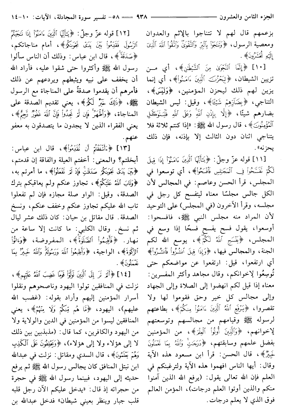 [12] قَوْلُهُ عَزَّ وَجَلَّ: {يَا أَيُّهَا الَّذِينَ آمَنُوا إِذَا نَاجَيْتُمُ الرَّسُولَ فَقَدِّمُوا بَيْنَ يَدَيْ نَجْوَاكُمْ} [المجادلة: 12] أمام مناجاتكم، {صَدَقَةً} [المجادلة: 12] قَالَ ابْنُ عَبَّاسٍ: وَذَلِكَ أَنَّ النَّاسَ سَأَلُوا رَسُولَ اللَّهِ صَلَّى اللَّهُ عَلَيْهِ وَسَلَّمَ وَأَكْثَرُوا حَتَّى شَقُّوا عَلَيْهِ، فَأَرَادَ اللَّهُ أَنْ يُخَفِّفَ عَلَى نَبِيِّهِ وَيُثَبِّطَهُمْ وَيَرْدَعَهُمْ عَنْ ذَلِكَ فَأَمَرَهُمْ أَنْ يُقَدِّمُوا صَدَقَةً عَلَى الْمُنَاجَاةِ مَعَ الرَّسُولِ صَلَّى اللَّهُ عَلَيْهِ وَسَلَّمَ, {ذَلِكَ خَيْرٌ لَكُمْ} [المجادلة: 12] يَعْنِي تَقْدِيمُ الصَّدَقَةِ عَلَى الْمُنَاجَاةِ، {وَأَطْهَرُ فَإِنْ لَمْ تَجِدُوا فَإِنَّ اللَّهَ غَفُورٌ رَحِيمٌ} [المجادلة: 12] يَعْنِي الْفُقَرَاءَ الَّذِينَ لَا يَجِدُونَ مَا يَتَصَدَّقُونَ بِهِ مَعْفُوٌّ عَنْهُمْ.