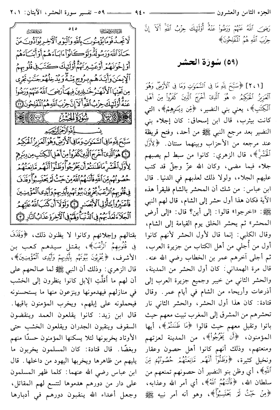 (59) سورة الحشر [1 - 2] {سَبَّحَ لِلَّهِ مَا فِي السَّمَاوَاتِ وَمَا فِي الْأَرْضِ وَهُوَ الْعَزِيزُ الْحَكِيمُ} [الحشر: 1] {هُوَ الَّذِي أَخْرَجَ الَّذِينَ كَفَرُوا مِنْ أَهْلِ الْكِتَابِ} [الحشر: 2] يَعْنِي بَنِي النَّضِيرِ، {مِنْ دِيَارِهِمْ} [الحشر: 2] الَّتِي كَانَتْ بِيَثْرِبَ، قَالَ ابْنُ إِسْحَاقَ: كَانَ إِجْلَاءُ بَنِي النَّضِيرِ بَعْدَ مَرْجِعِ النَّبِيِّ صَلَّى اللَّهُ عَلَيْهِ وَسَلَّمَ مِنْ أُحُدٍ، وَفَتْحَ قُرَيْظَةَ عِنْدَ مَرْجِعِهِ مِنَ الْأَحْزَابِ وبينهما سنتان.