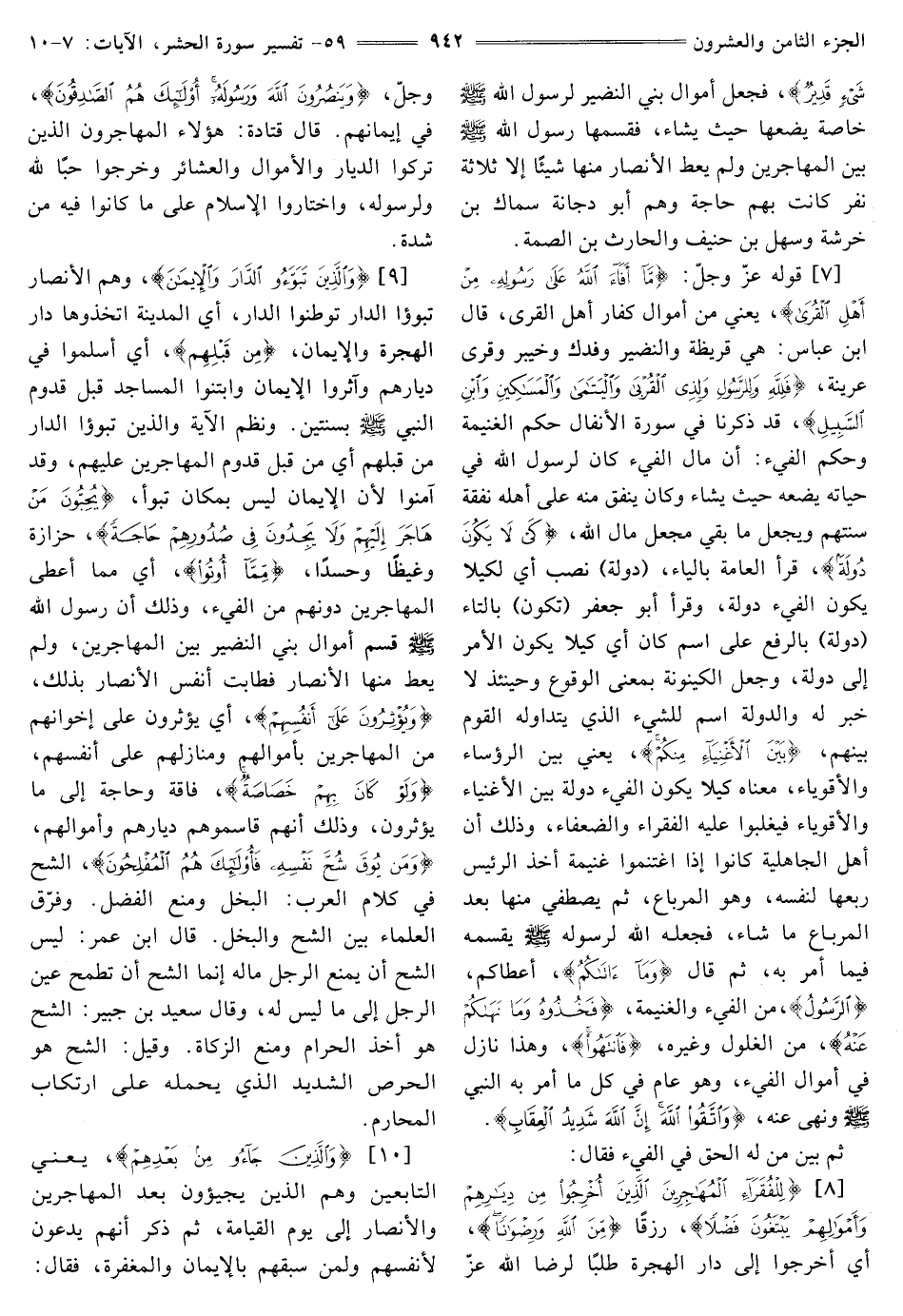 [7] قَوْلُهُ عَزَّ وَجَلَّ: {مَا أَفَاءَ اللَّهُ عَلَى رَسُولِهِ مِنْ أَهْلِ الْقُرَى} [الحشر: 7] يَعْنِي مِنْ أَمْوَالِ كُفَّارِ أَهْلِ الْقُرَى، قَالَ ابْنُ عَبَّاسٍ: هِيَ قُرَيْظَةُ وَالنَّضِيرُ وَفَدَكُ وَخَيْبَرُ وَقُرَى عُرَيْنَةَ: {فَلِلَّهِ وَلِلرَّسُولِ وَلِذِي الْقُرْبَى وَالْيَتَامَى وَالْمَسَاكِينِ وَابْنِ السَّبِيلِ} [الحشر: 7] قَدْ ذَكَرْنَا فِي سُورَةِ الْأَنْفَالِ حُكْمَ الْغَنِيمَةِ وَحُكْمَ الْفَيْءِ: إِنَّ مَالَ الْفَيْءِ كَانَ لِرَسُولِ اللَّهِ فِي حَيَاتِهِ يَضَعُهُ حَيْثُ يَشَاءُ وَكَانَ يُنْفِقُ مِنْهُ عَلَى أَهْلِهِ نَفَقَةَ سَنَتِهِمْ وَيَجْعَلُ مَا بَقِيَ مجعل مال الله, {كَيْ لَا يَكُونَ دُولَةً} [الحشر: 7] قرأ العامة بالياء {دُولَةً} [الحشر: 7] نُصِبَ أَيْ لِكَيْلَا يَكُونَ الْفَيْءُ دُولَةً, وَقَرَأَ أَبُو جَعْفَرٍ (تَكُونَ) بِالتَّاءِ (دُولَةٌ) بِالرَّفْعِ عَلَى اسْمِ كَانَ أَيْ كَيْلَا يَكُونَ الْأَمْرُ إِلَى دُولَةٍ, وَجَعَلَ الْكَيْنُونَةَ بِمَعْنَى الْوُقُوعِ وَحِينَئِذٍ لَا خَبَرَ لَهُ وَالدُّولَةُ اسْمٌ لِلشَّيْءِ الَّذِي يَتَدَاوَلُهُ الْقَوْمُ بَيْنَهُمْ, {بَيْنَ الْأَغْنِيَاءِ مِنْكُمْ} [الحشر: 7] يعني بين الرؤساء والأقوياء, معناه كيلا يكون الفيء دولة بين الأغنياء وَالْأَقْوِيَاءِ فَيَغْلِبُوا عَلَيْهِ الْفُقَرَاءَ وَالضُّعَفَاءَ, وَذَلِكَ أَنَّ أَهْلَ الْجَاهِلِيَّةِ كَانُوا إِذَا اغْتَنَمُوا غَنِيمَةً أَخْذَ الرَّئِيسُ رُبُعَهَا لِنَفْسِهِ, وَهُوَ الْمِرْبَاعُ, ثُمَّ يَصْطَفِي مِنْهَا بَعْدَ الْمِرْبَاعِ مَا شَاءَ, فَجَعَلَهُ اللَّهُ لِرَسُولِهِ صَلَّى اللَّهُ عَلَيْهِ وَسَلَّمَ يَقْسِمُهُ فِيمَا أُمِرَ بِهِ, ثُمَّ قَالَ {وَمَا آتَاكُمُ} [الحشر: 7] أعطاكم, {الرَّسُولُ} [الحشر: 7] مِنَ الْفَيْءِ وَالْغَنِيمَةِ, {فَخُذُوهُ وَمَا نَهَاكُمْ عَنْهُ} [الحشر: 7] من الغلول وغيره, {فَانْتَهُوا} [الحشر: 7] وَهَذَا نَازِلٌ فِي أَمْوَالِ الْفَيْءِ, وَهُوَ عَامٌّ فِي كُلِّ مَا أَمَرَ بِهِ النَّبِيُّ صَلَّى اللَّهُ عليه وسلم ونهى عَنْهُ, {وَاتَّقُوا اللَّهَ إِنَّ اللَّهَ شَدِيدُ الْعِقَابِ} [الحشر: 7] ثُمَّ بَيَّنَ مَنْ لَهُ الْحَقُّ فِي الْفَيْءِ فَقَالَ: