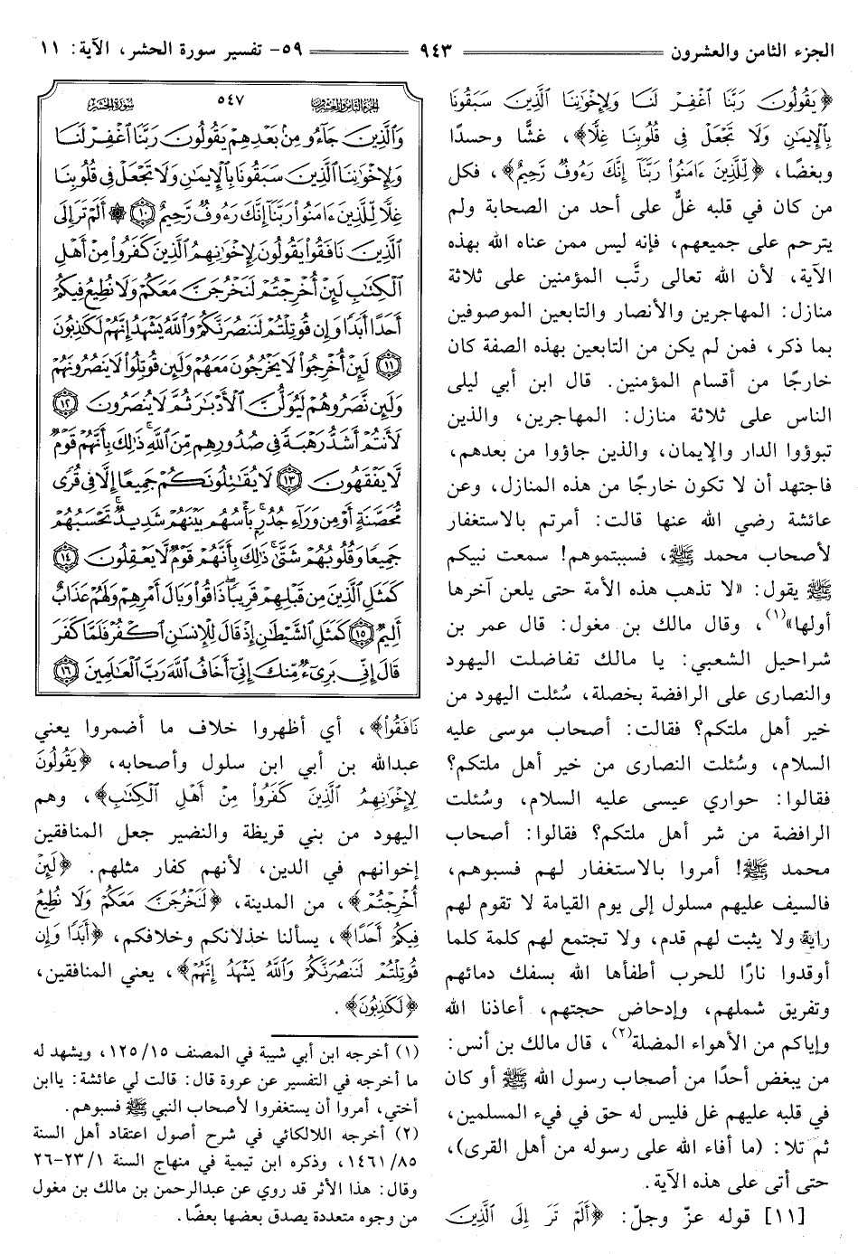 [11] قَوْلُهُ عَزَّ وَجَلَّ: {أَلَمْ تَرَ إِلَى الَّذِينَ نَافَقُوا} [الحشر: 11] أَيْ أَظْهَرُوا خِلَافَ مَا أَضْمَرُوا يَعْنِي عَبْدَ اللَّهِ بْنَ أُبَيٍّ ابْنَ سَلُولَ وَأَصْحَابَهُ، {يَقُولُونَ لِإِخْوَانِهِمُ الَّذِينَ كَفَرُوا مِنْ أَهْلِ الْكِتَابِ} [الحشر: 11] وهم الْيَهُودِ مِنْ بَنِي قُرَيْظَةَ وَالنَّضِيرِ جَعْلَ الْمُنَافِقِينَ إِخْوَانَهُمْ فِي الدِّينِ؛ لِأَنَّهُمْ كُفَّارٌ مِثْلَهُمْ.