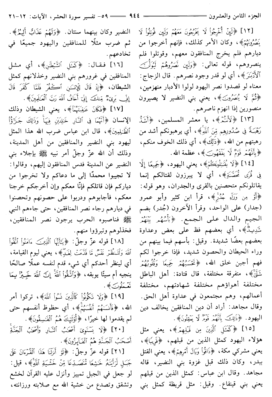 [17] {فَكَانَ عَاقِبَتَهُمَا} [الحشر: 17] يَعْنِي الشَّيْطَانَ وَذَلِكَ الْإِنْسَانَ {أَنَّهُمَا فِي النَّارِ خَالِدَيْنِ فِيهَا وَذَلِكَ جَزَاءُ الظَّالِمِينَ} [الحشر: 17] قَالَ ابْنُ عَبَّاسٍ ضَرَبَ اللَّهُ هَذَا الْمَثَلَ لِيَهُودِ بَنِي النَّضِيرِ وَالْمُنَافِقِينَ مِنْ أَهْلِ الْمَدِينَةِ، وَذَلِكَ أَنَّ اللَّهَ عَزَّ وَجَلَّ أَمَرَ نَبِيَّهُ صَلَّى اللَّهُ عَلَيْهِ وَسَلَّمَ بِإِجْلَاءِ بَنِي النَّضِيرِ عَنِ الْمَدِينَةِ فَدَسَّ الْمُنَافِقُونَ إِلَيْهِمْ، وَقَالُوا: لَا تُجِيبُوا مُحَمَّدًا إِلَى مَا دَعَاكُمْ وَلَا تَخْرُجُوا مِنْ دِيَارِكُمْ فَإِنْ قَاتَلَكُمْ فَإِنَّا مَعَكُمْ وَإِنْ أَخْرَجَكُمْ خرجنا معكم، فأجابوهم ودربوا عَلَى حُصُونِهِمْ وَتَحَصَّنُوا فِي دِيَارِهِمْ رَجَاءَ نَصْرِ الْمُنَافِقِينَ، حَتَّى جَاءَهُمُ النَّبِيُّ صَلَّى اللَّهُ عَلَيْهِ وَسَلَّمَ فَنَاصَبُوهُ الْحَرْبَ يَرْجُونَ نَصْرَ الْمُنَافِقِينَ، فخذلوهم وتبرؤوا منهم.